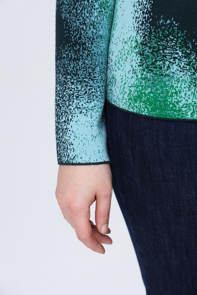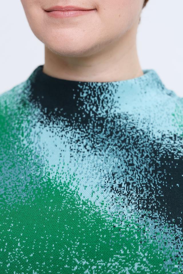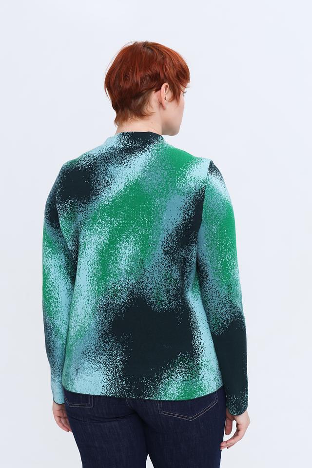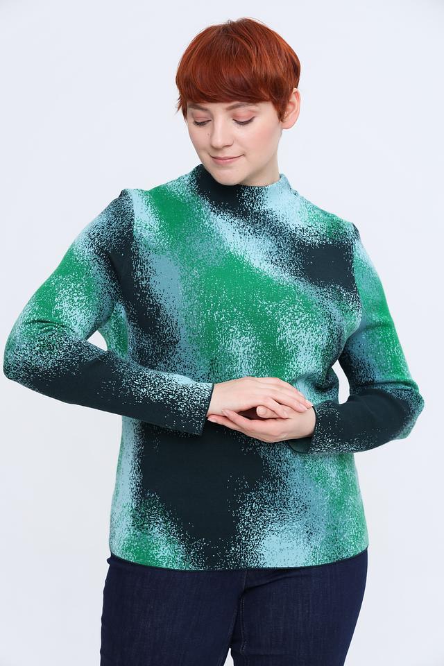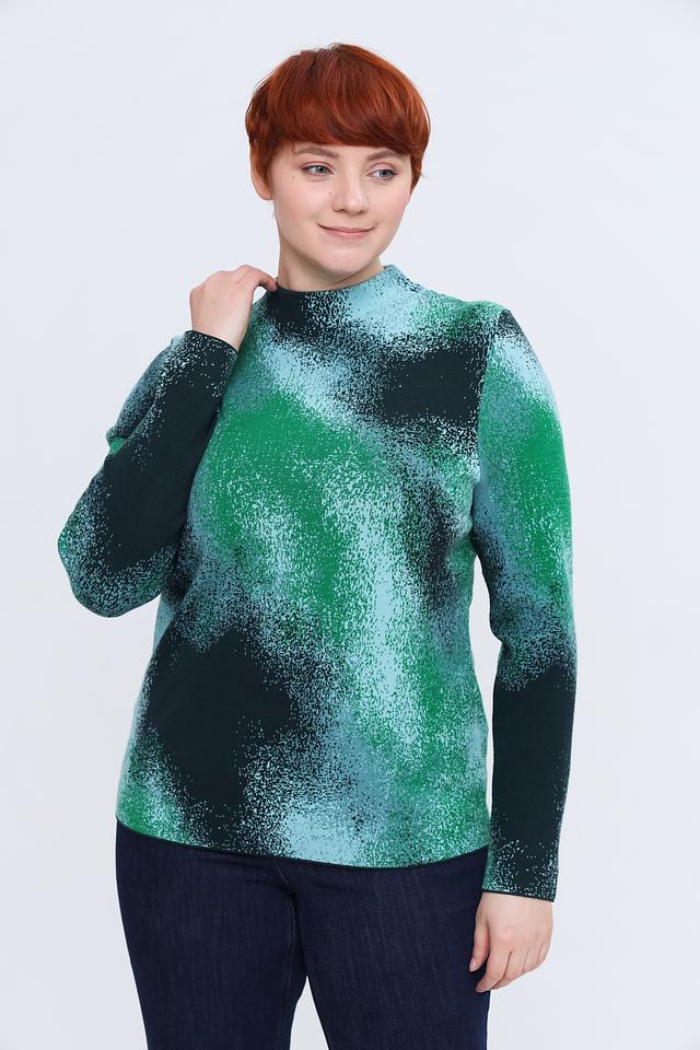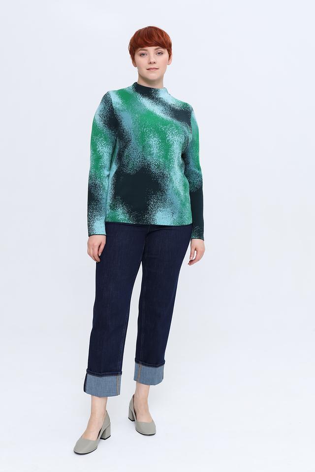 Пуловер имеет свободный крой, который не сковывает движений, и удобный вырез горловины. Особенностью модели является яркий и необычный абстрактный принт в зеленых тонах, который придаёт изделию индивидуальность.