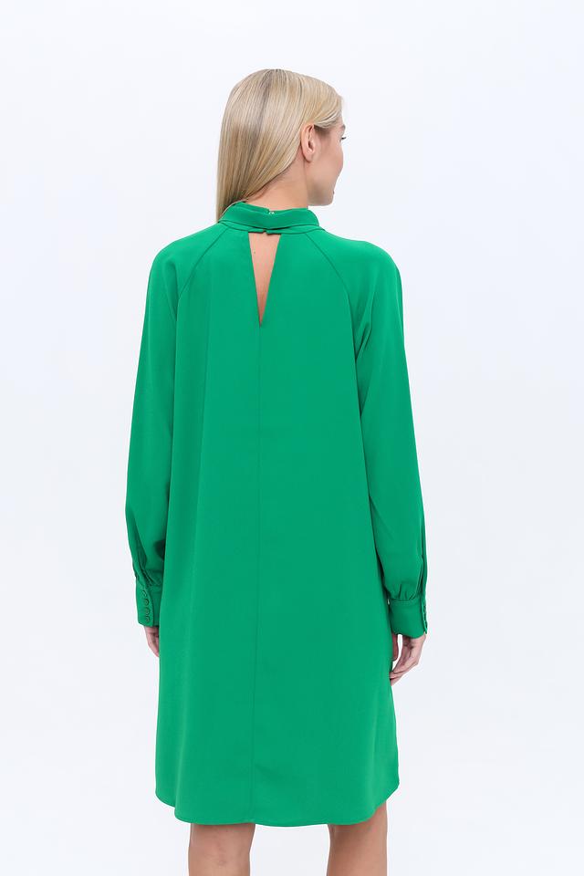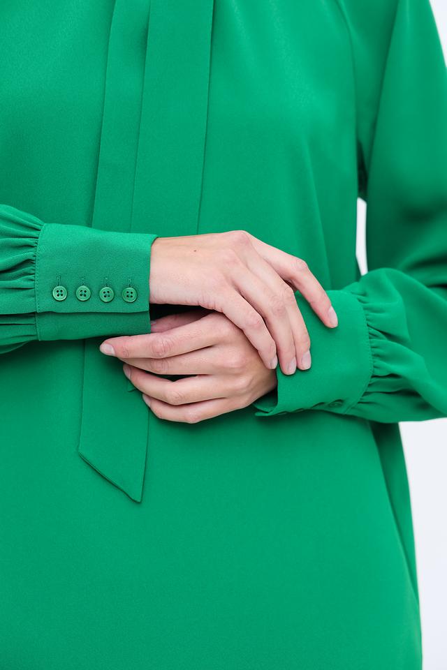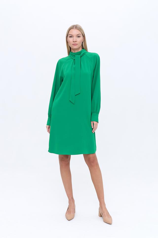 Модель имеет прямой силуэт, длинные рукава и высокий воротник с декоративной завязкой, создающей изящный акцент. Платье выполнено из 100% полиэстера, что обеспечивает комфорт в носке и простоту ухода.