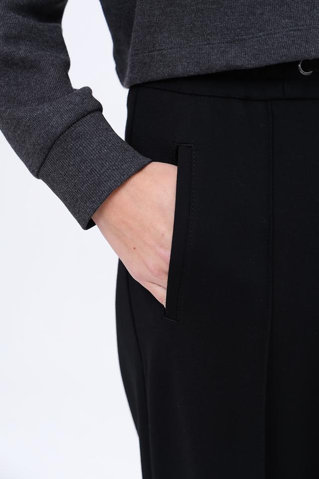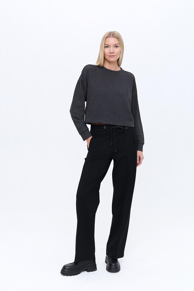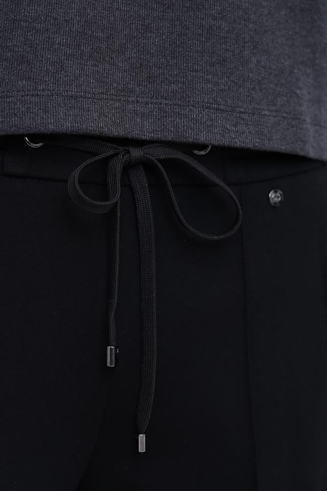 Брюки имеют прямой крой, который визуально вытягивает силуэт и обеспечивает комфорт при носке. Пояс дополнен кулиской с металлическими фиксаторами, что позволяет регулировать посадку по фигуре.