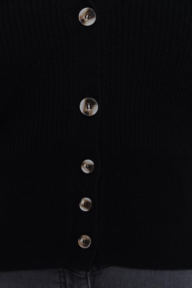 Кардиган имеет V-образный вырез и застёжку на пуговицы, что позволяет создавать разнообразные образы. Тонкая вязка делает его лёгким и удобным в носке.