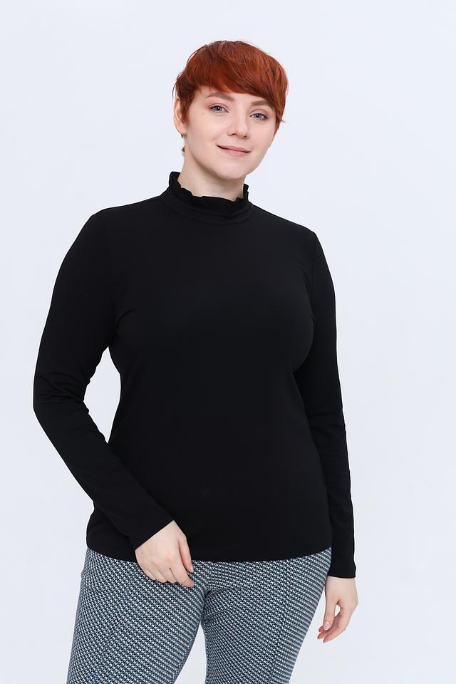 Чёрный лонгслив от Gerry Weber с изящным воротником-стойкой и рюшами. Эта модель выполнена из мягкого и приятного к телу трикотажа, обеспечивающего комфорт в течение всего дня. Состав: модал 50%, хлопок 45%, эластан 5%