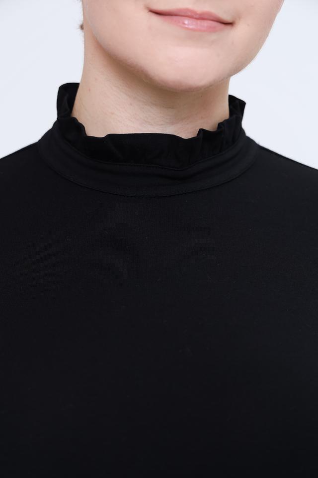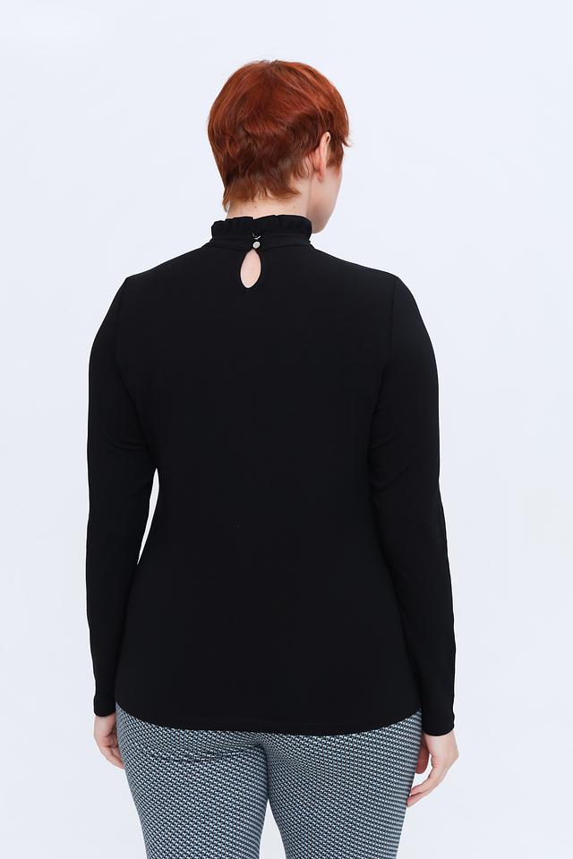 Лонгслив имеет облегающий силуэт, который подчеркивает фигуру, и воротник-стойку, украшенный нежной рюшью. Такой деликатный декор придает модели женственности и элегантности.