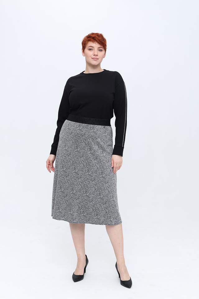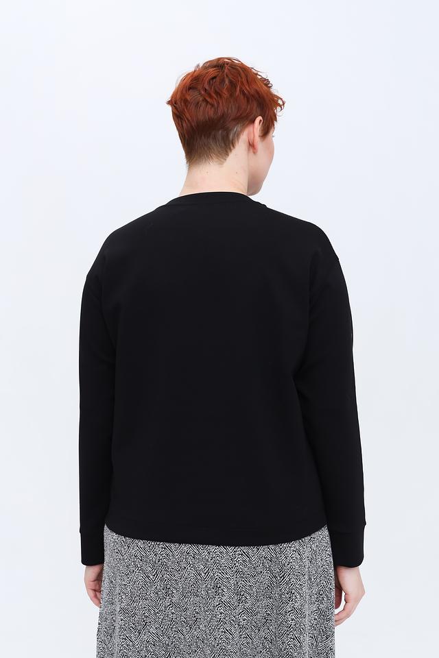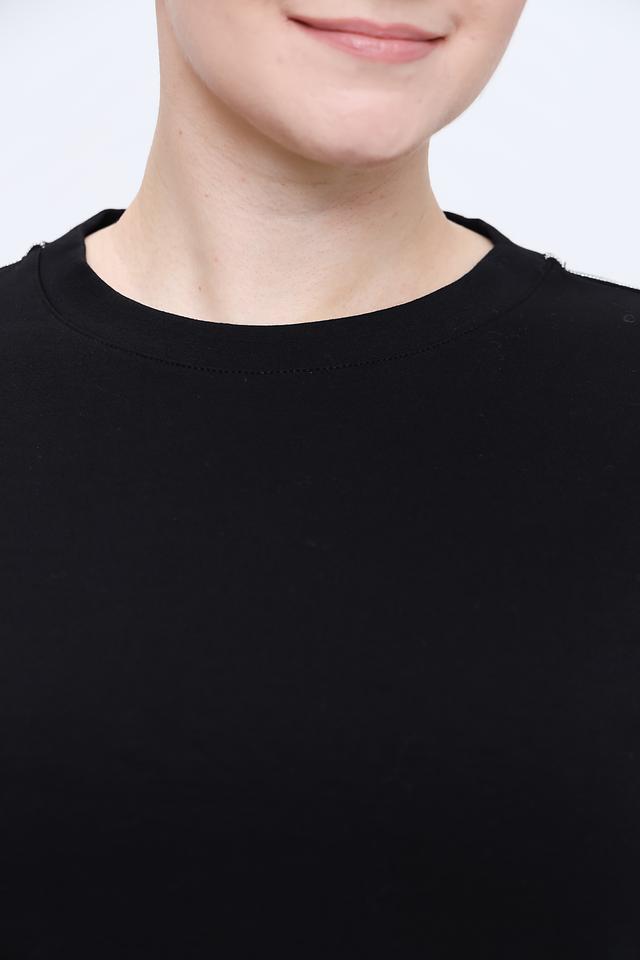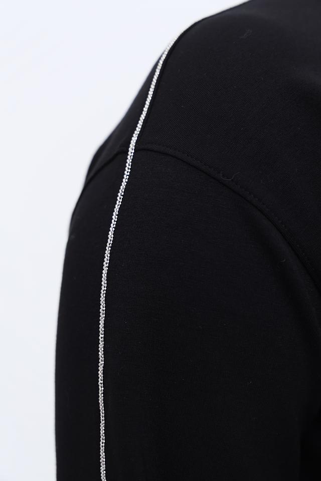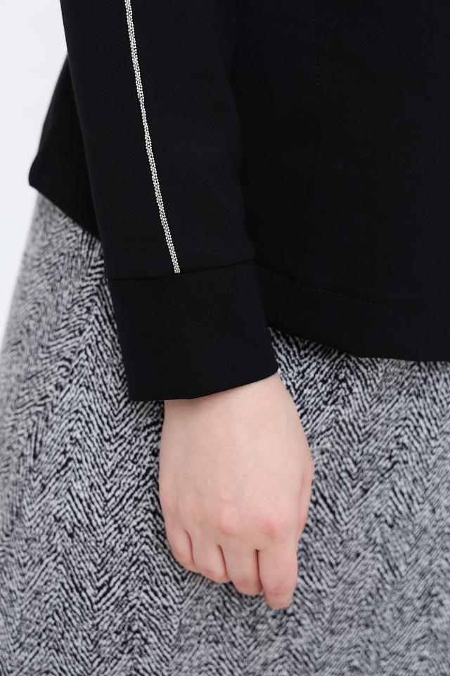 Модель имеет классический круглый вырез горловины и длинные рукава, украшенные контрастной полоской. Прямой крой обеспечивает комфортную посадку по фигуре, не сковывая движений.