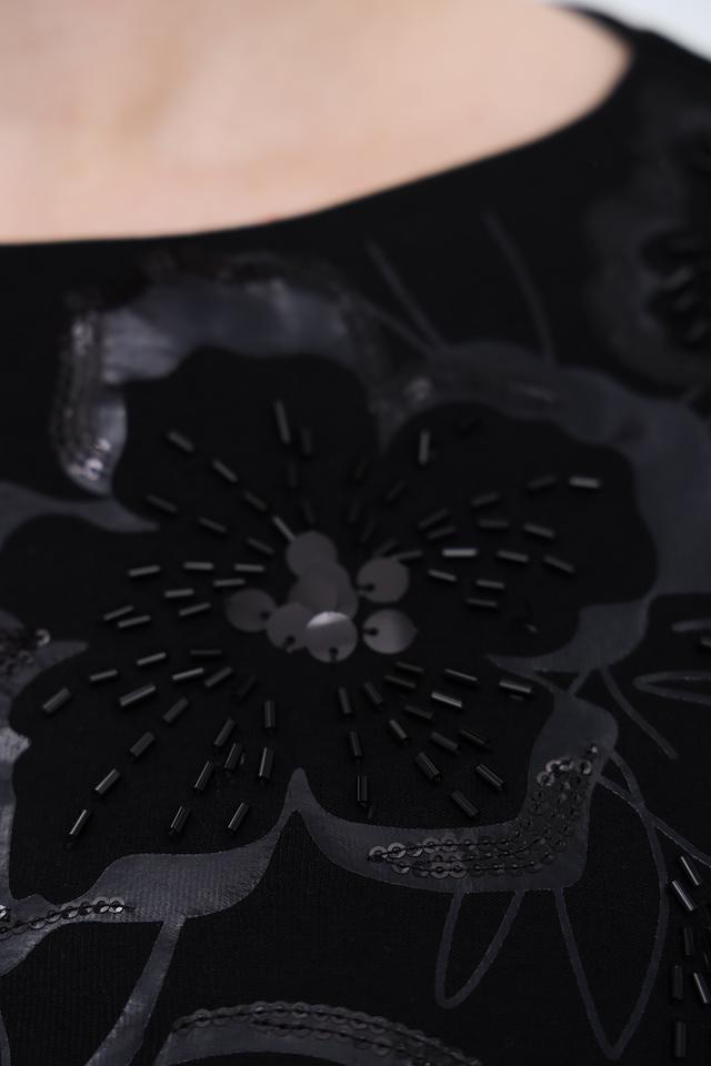 Передняя часть пуловера украшена крупным цветочным принтом, выполненным в технике аппликации с использованием различных текстур и материалов. Это придает изделию особый шарм и изысканность.