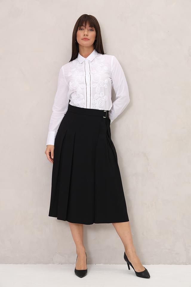 Модель имеет длину миди и плиссированную юбку, что придает ей изящество и лёгкость. Декоративный пояс с пряжкой акцентирует талию и добавляет образу завершенность.