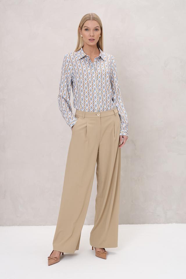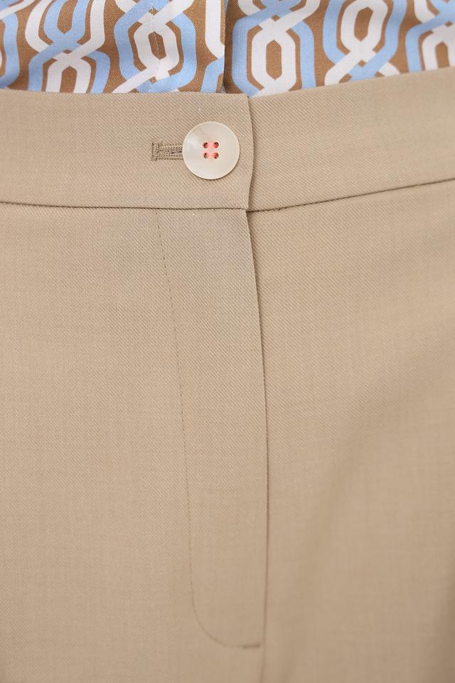 Брюки имеют классический крой с завышенной талией и широкими штанинами, что визуально удлиняет силуэт и создает женственный образ. Передняя часть брюк дополнена аккуратными складками, придающими им более изысканный вид. Застежка на молнию и пуговицу обеспечивает надежную фиксацию.