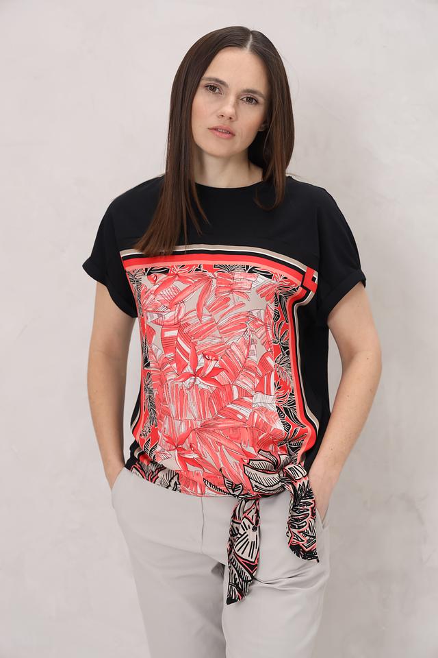 Стильная блуза Gerry Weber черного цвета с ярким цветочным принтом. Модель с короткими рукавами и завязками по бокам, выполненная из мягкого и приятного к телу сочетания хлопка и модала. Состав: хлопок 47%, модал 47%, эластан 6%