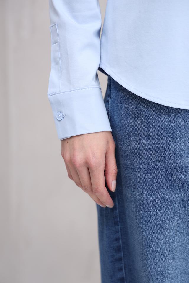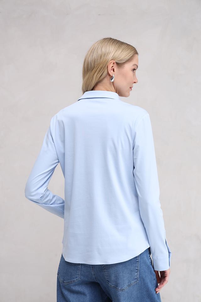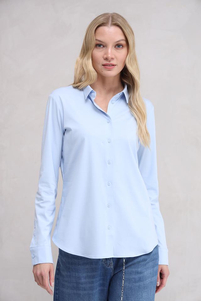 Рубашка имеет голубой цвет, который легко сочетается с различными элементами одежды. Застежка на пуговицы по всей длине, воротник классической формы. Рукава рубашки имеют манжеты на пуговицах.