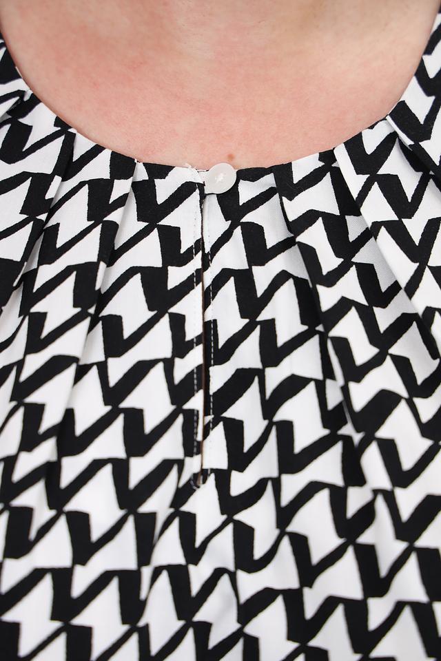 Основной цвет блузы – белый, но её украшает выразительный чёрно-белый геометрический принт, напоминающий клетку. Небольшая сборка на груди добавляет изящества и женственности силуэту.