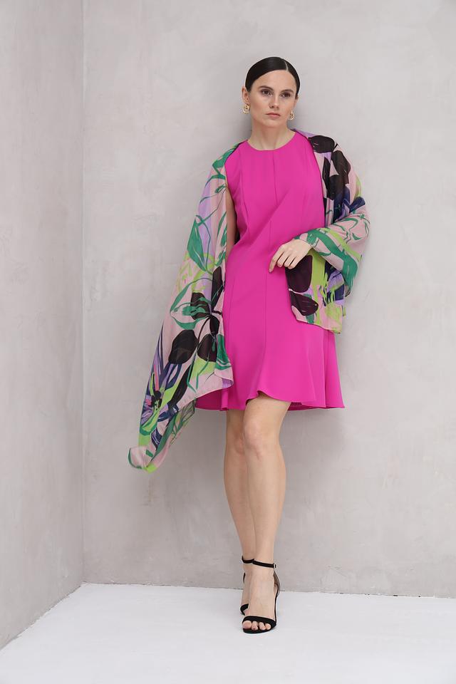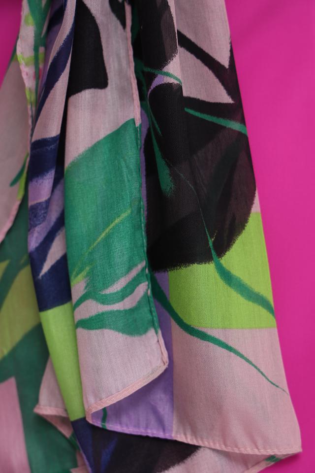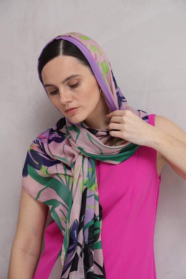 Дизайн шарфа представлен ярким и красочным цветочным принтом, сочетающим в себе оттенки зеленого, фиолетового, черного и розового. Такое сочетание цветов позволяет легко сочетать шарф с различными нарядами, добавляя им свежести и оригинальности.