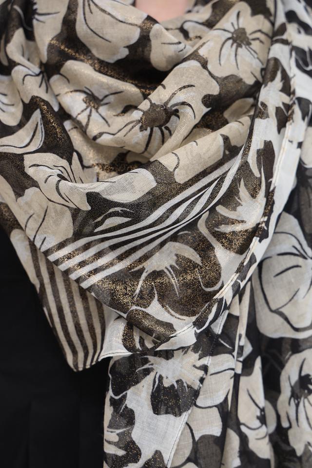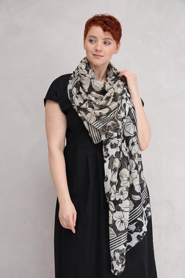 Этот шарф от Gerry Weber – прекрасный выбор для тех, кто ценит стиль и комфорт. Шарф выполнен в бежевых тонах и украшен ярким цветочным принтом, сочетающим в себе оттенки чёрного, белого и серого.