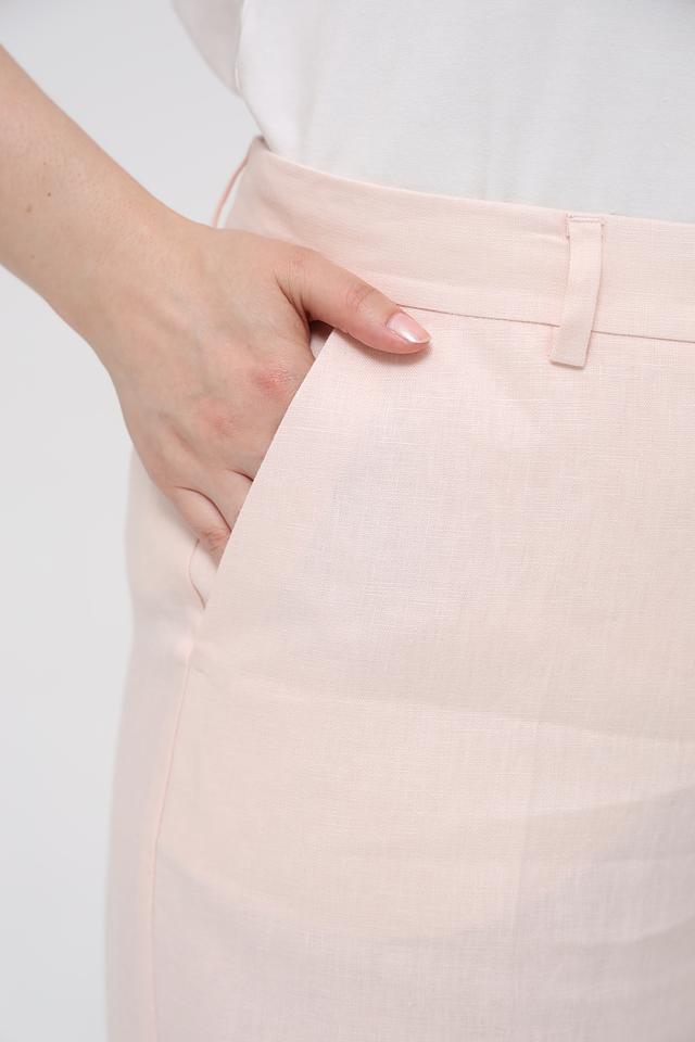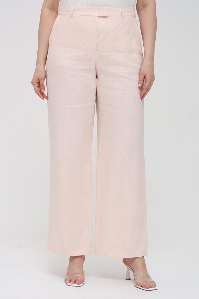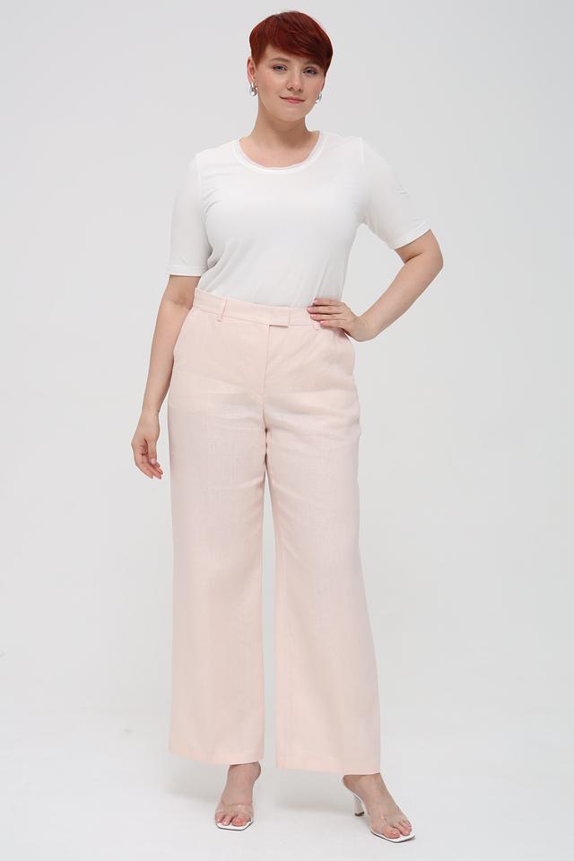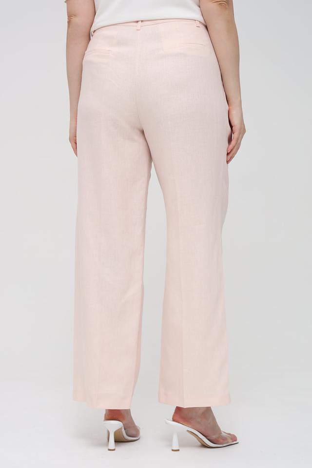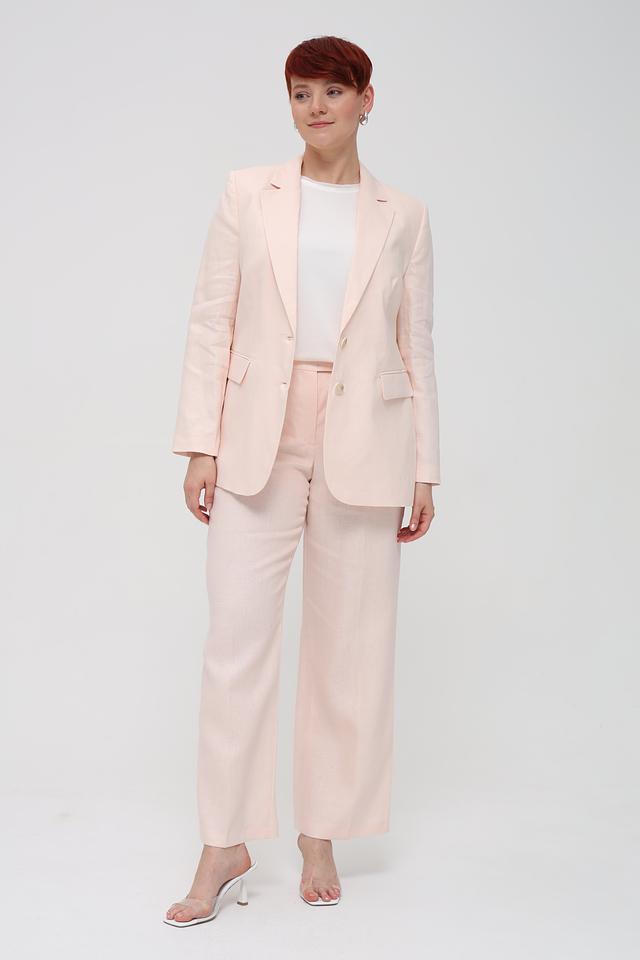 Брюки имеют классический прямой крой и стандартную посадку по талии, что делает их универсальными и подходящими для различных типов фигур. Нежный персиковый оттенок придаёт образу легкость и свежесть.