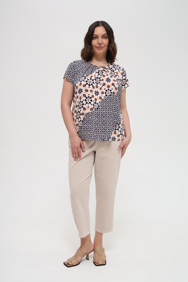 Блуза имеет короткие рукава и округлый вырез горловины, который дополнен небольшими складками, создающими легкий объем. Привлекает внимание яркий геометрический принт, выполненный в сочетании синего, белого и коричневого цветов.