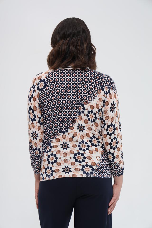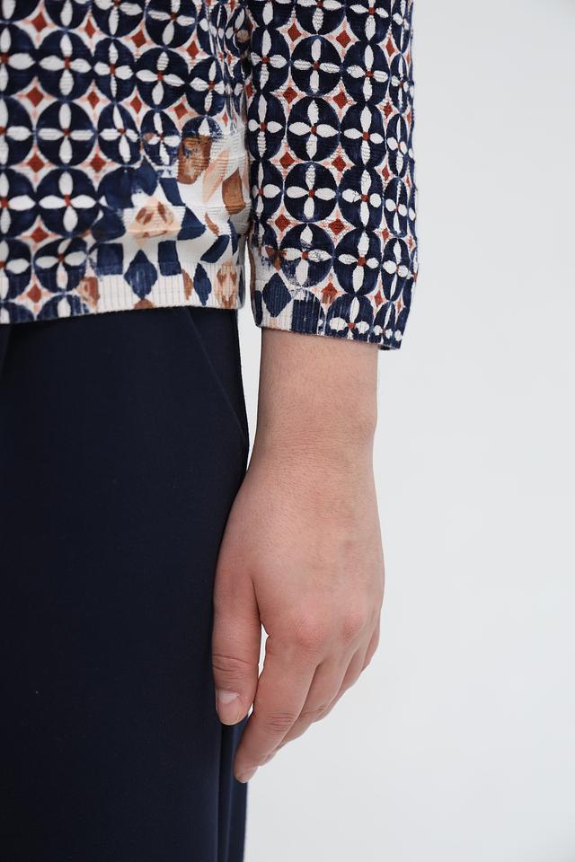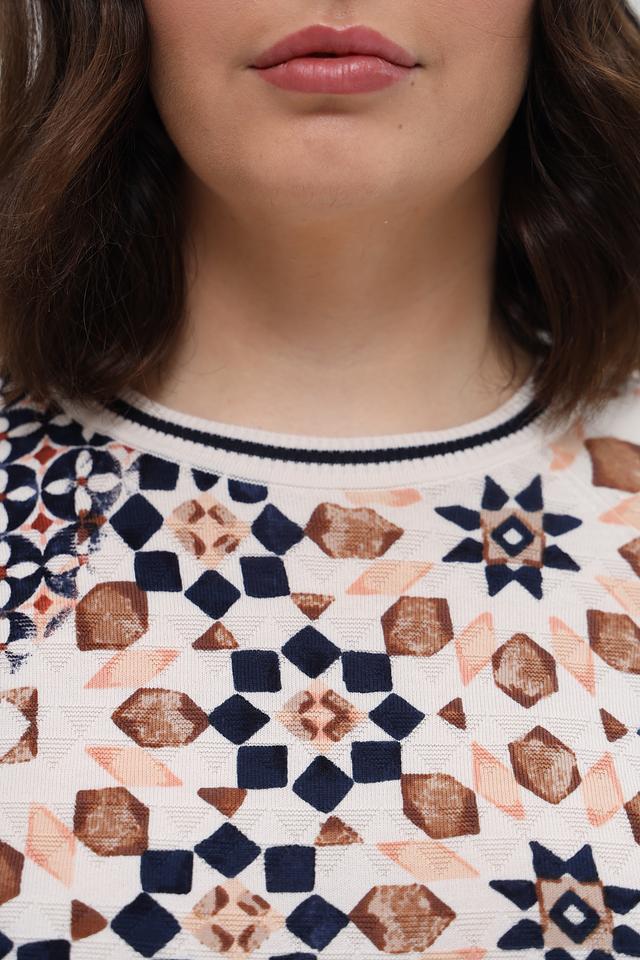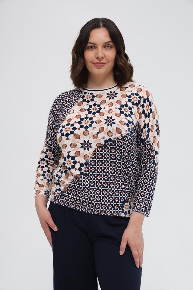 Пуловер имеет округлый вырез горловины и длинные рукава. Его особенностью является яркий геометрический принт, выполненный в бежевых, коричневых и тёмно-синих тонах. Такой рисунок делает этот пуловер уникальным и привлекательным.