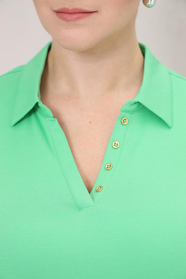 Модель имеет классический крой с короткими рукавами и воротником поло. Планка поло украшена рядом из пяти пуговиц в тон изделия. Футболка поло идеально подходит для создания повседневных образов.