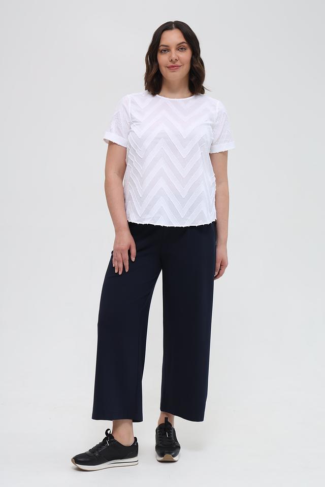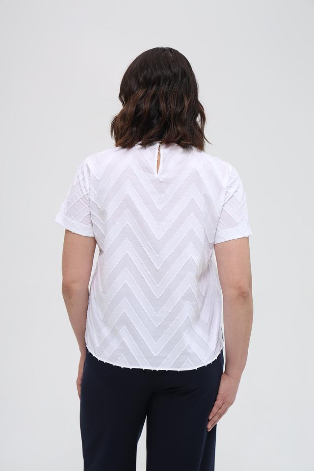 Эта стильная блуза от Gerry Weber EDITION выполнена в белом цвете и украшена выразительным геометрическим узором в виде зигзага. Модель имеет короткие рукава и округлый вырез горловины.