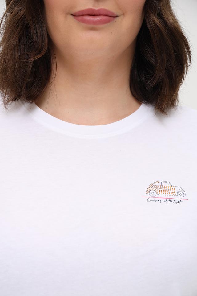 Футболка имеет классический прямой крой и короткие рукава с небольшими манжетами. На передней части футболки расположен небольшой, стильный принт с изображением ретро-автомобиля и надписью "Crossing with the light".