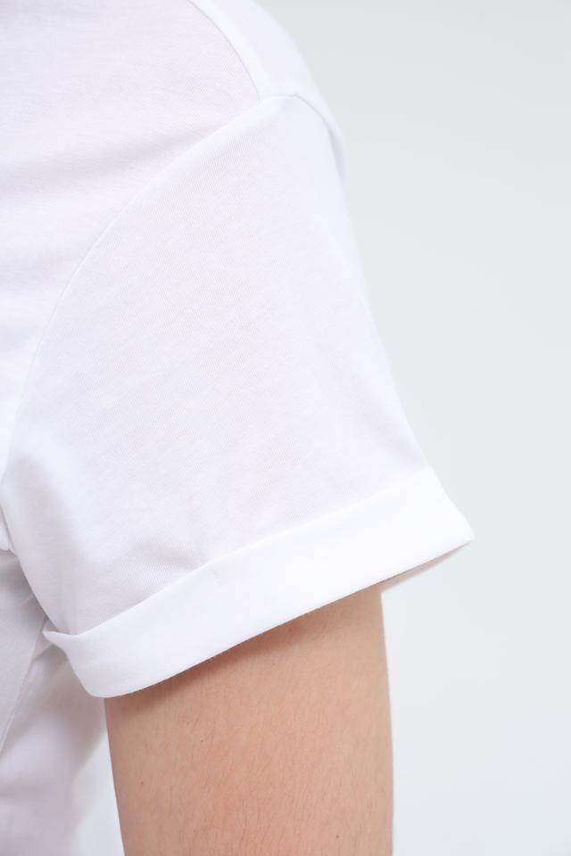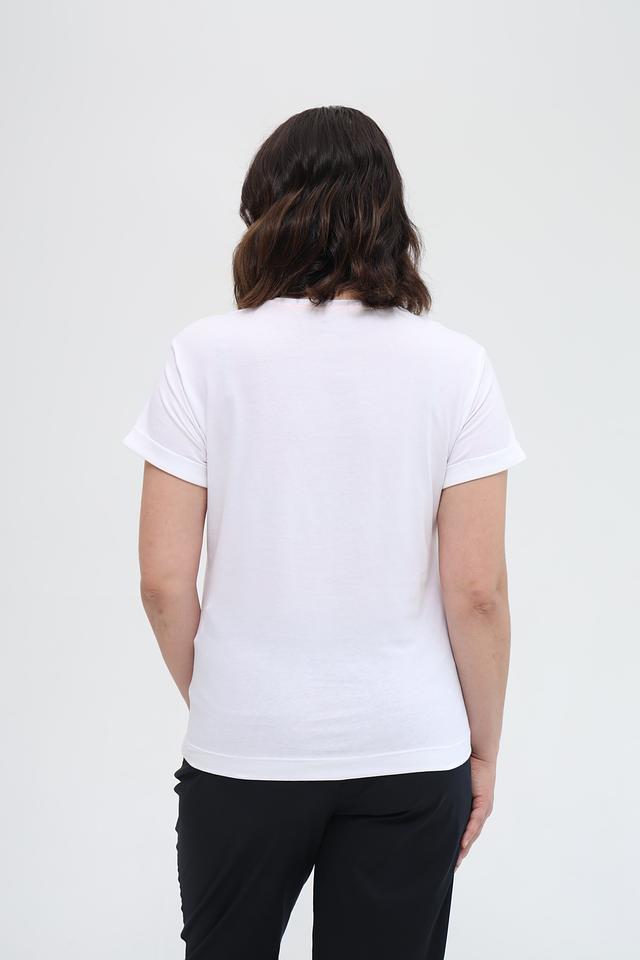 Футболка имеет прямой крой, короткие рукава с небольшим подворотом и круглый вырез горловины. Она идеально подходит для создания повседневных образов, сочетаясь с джинсами, шортами или юбками. Эта модель станет прекрасным выбором для тех, кто ценит комфорт, качество и оригинальный дизайн.