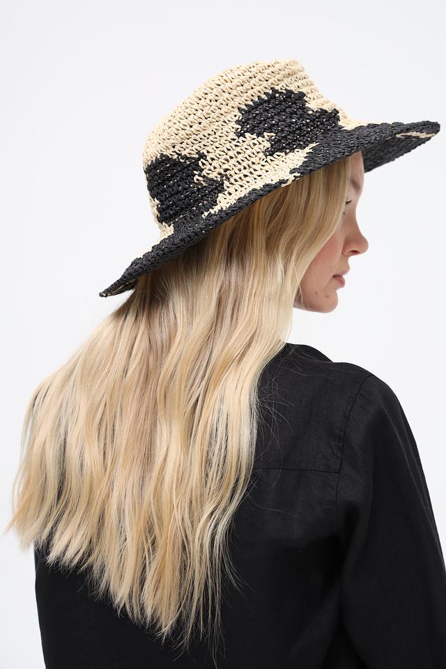 Шляпа имеет классическую форму с широкими полями, которые обеспечивают надежную защиту от солнечных лучей. Чередующиеся чёрные и бежевые полосы придают ей современный и стильный вид.