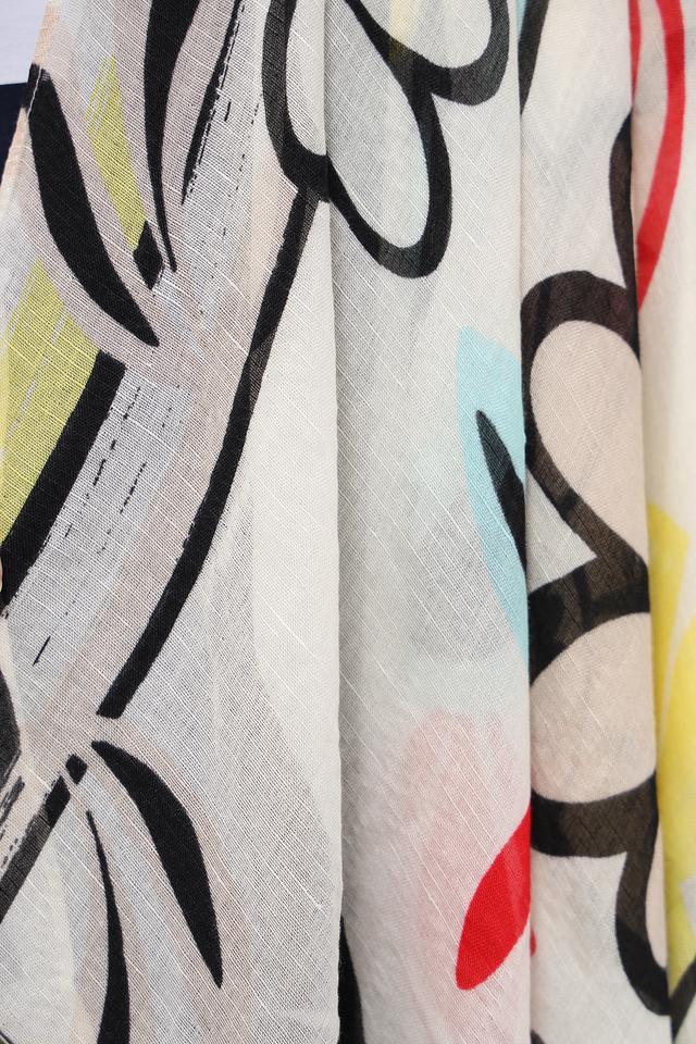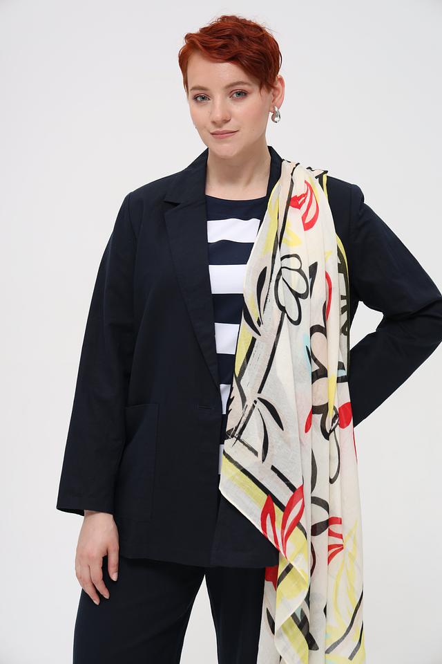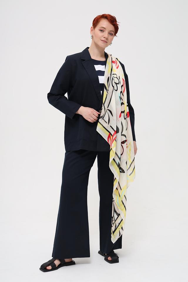 Платок изготовлен из высококачественной вискозы с добавлением льна, что делает его приятным на ощупь и обеспечивает хорошую драпировку. Благодаря своему составу, платок не мнется и легко ухаживается.