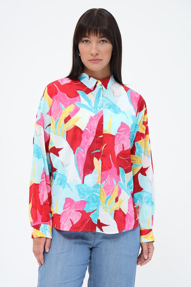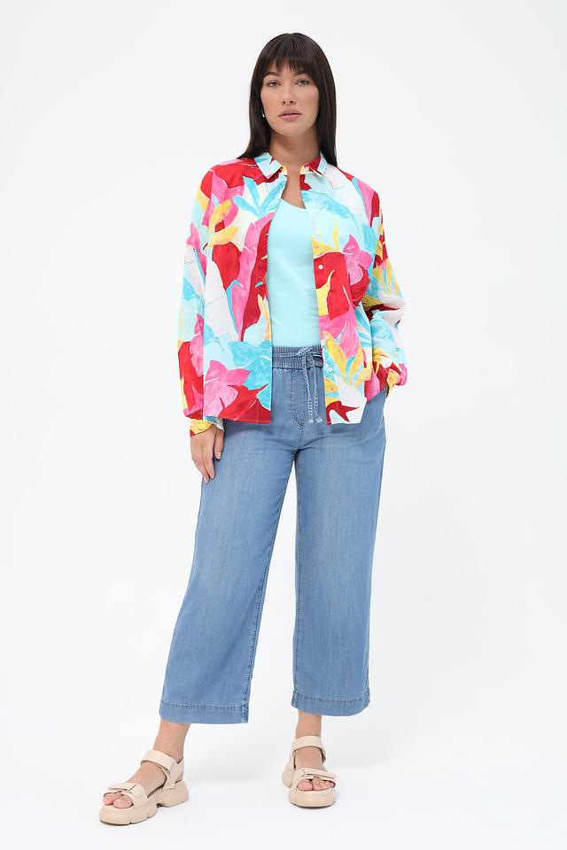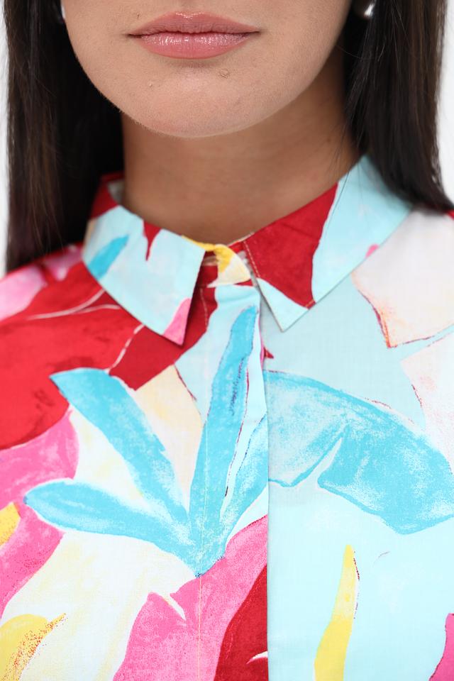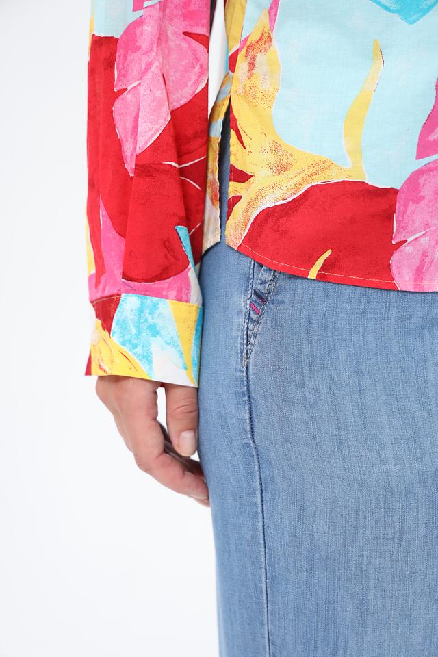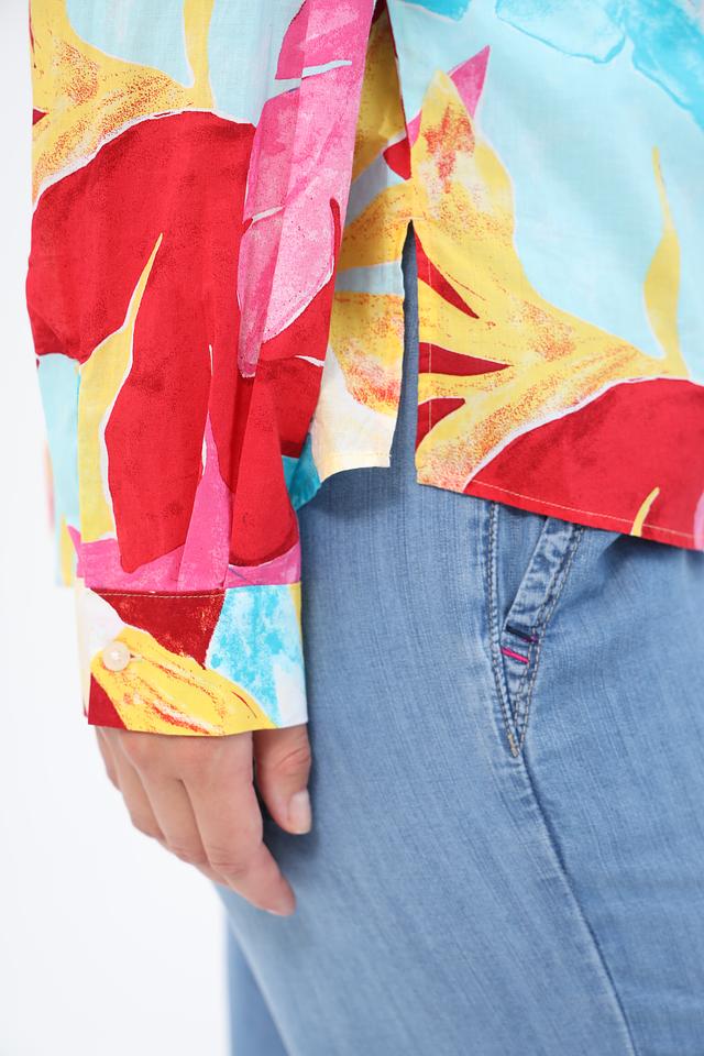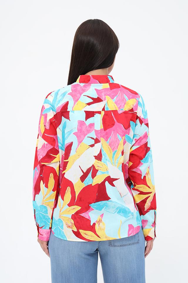 Блуза имеет свободный крой, длинные рукава и воротник-стойку с завязками, которые можно повязать различными способами, создавая разные силуэты. Особенностью модели является эффектный цветочный принт, сочетающий в себе оттенки красного, голубого, розового и желтого.