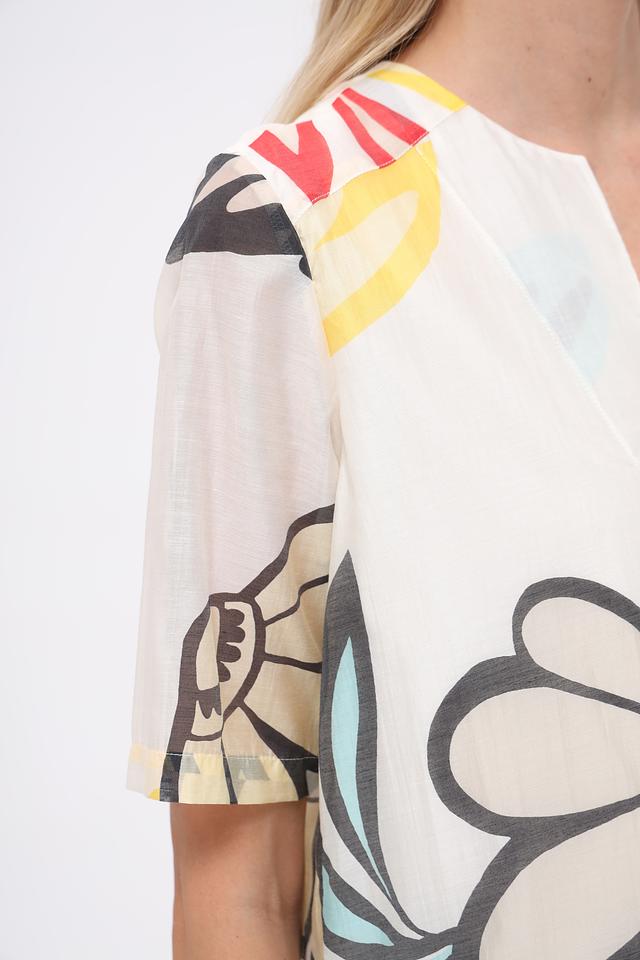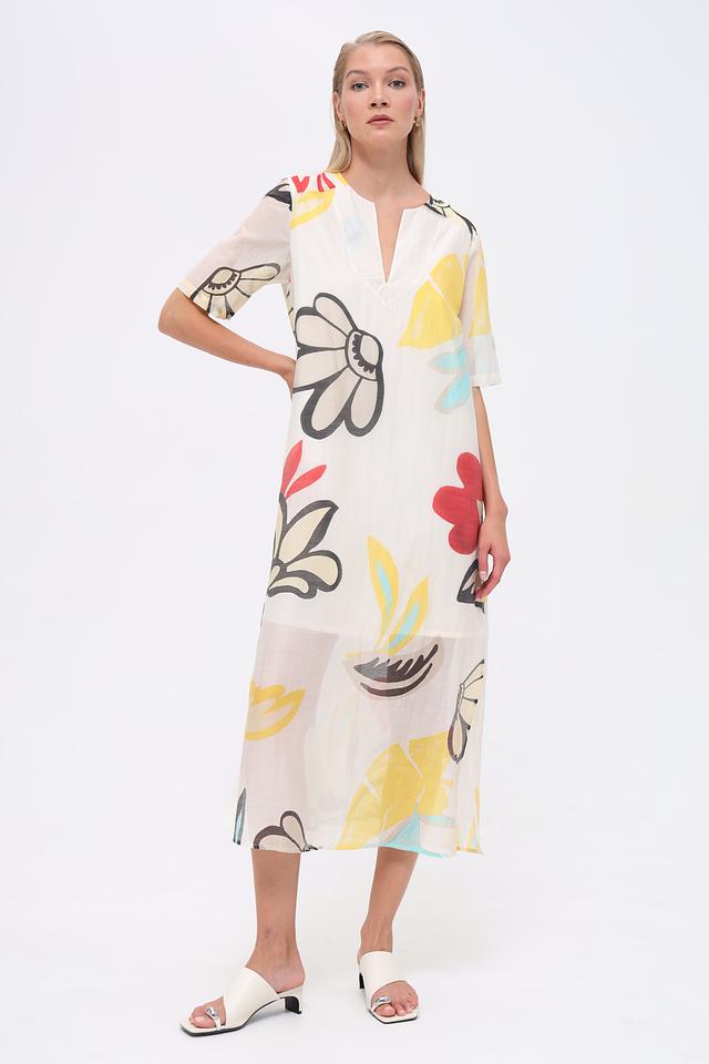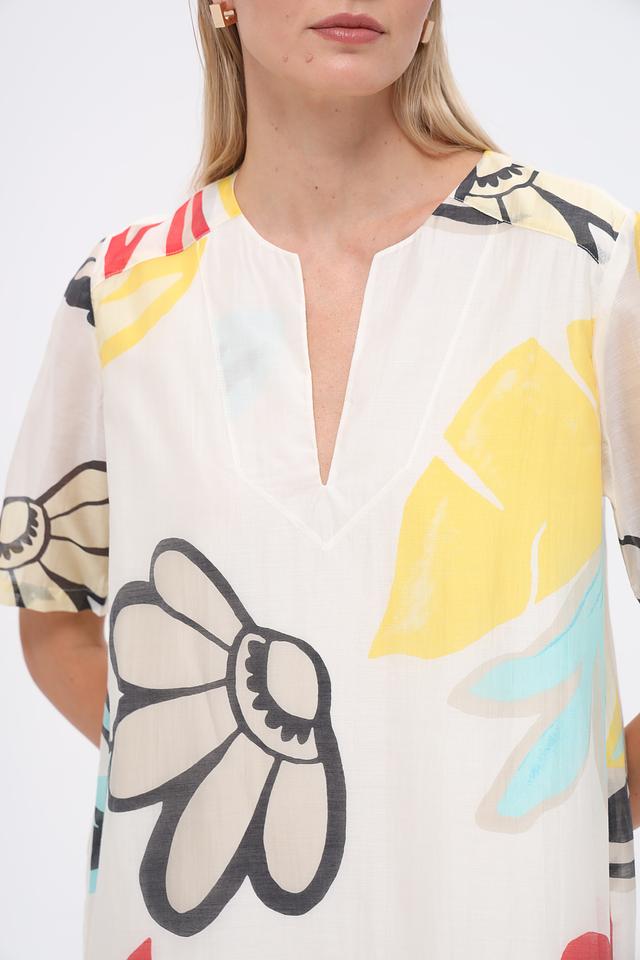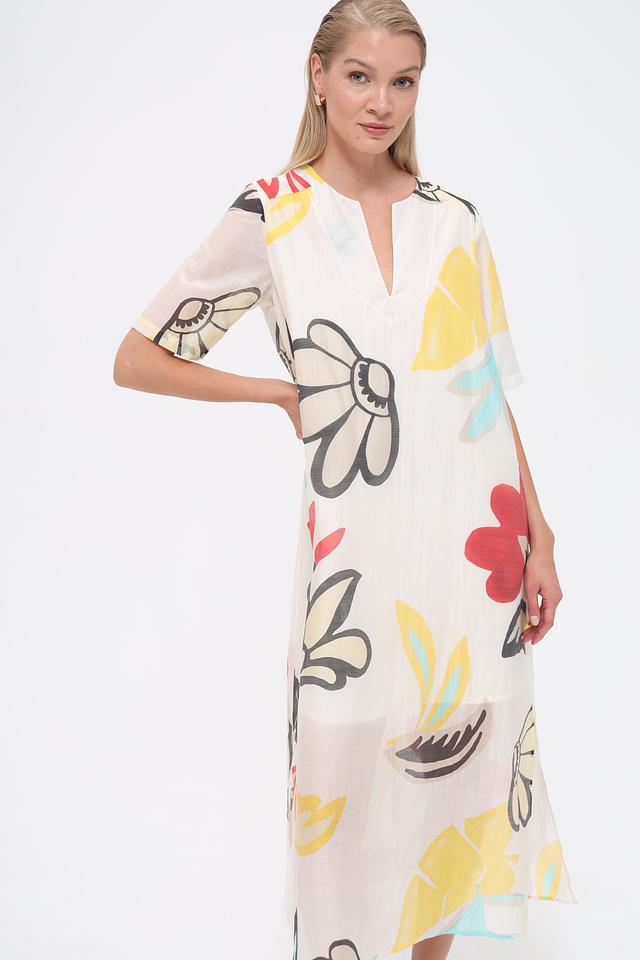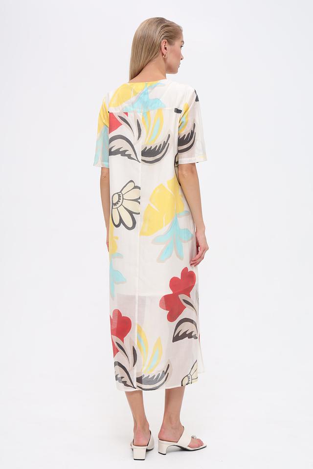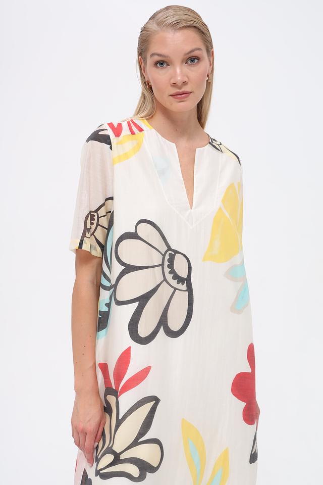 Модель имеет прямой, слегка свободный крой, который обеспечивает комфортную посадку по фигуре. V-образный вырез горловины и короткие рукава делают платье лёгким и воздушным. Платье выполнено из высококачественного лиоцела (85%) и полиэстера (15%), что обеспечивает приятные тактильные ощущения и простоту в уходе.