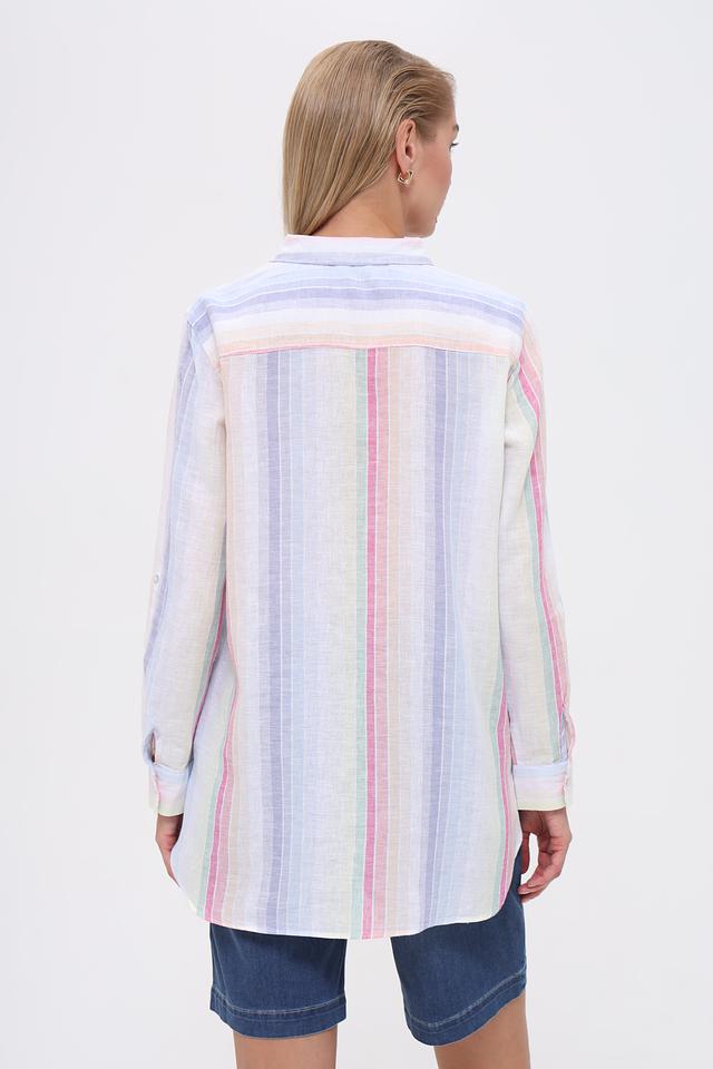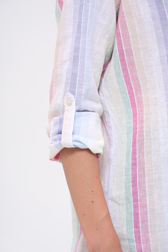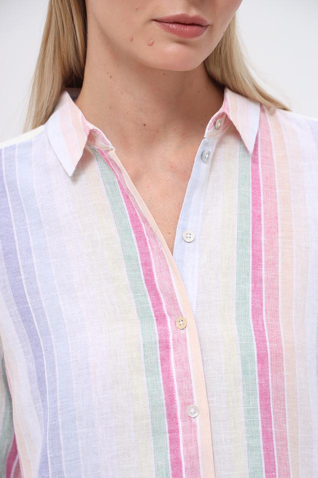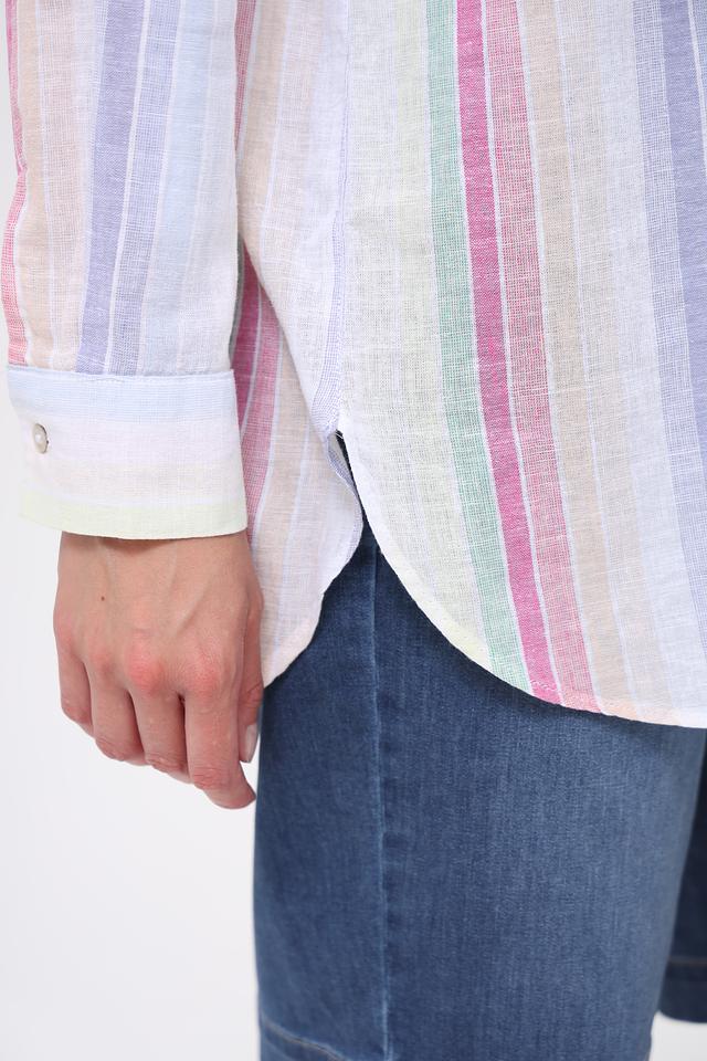 Рубашка имеет классический крой с длинными рукавами и воротником, который можно носить как застегнутым, так и расстегнутым для создания более расслабленного вида. Особенностью модели является яркий, разноцветный полосатый принт, который добавит вашему образу индивидуальности и свежести.