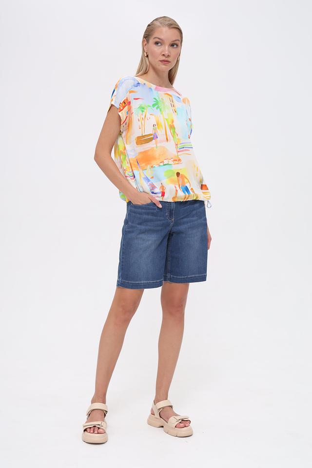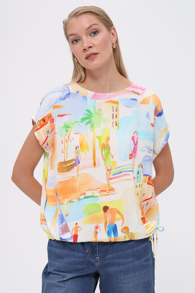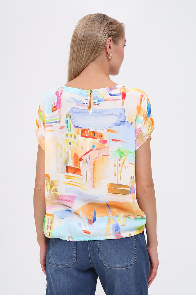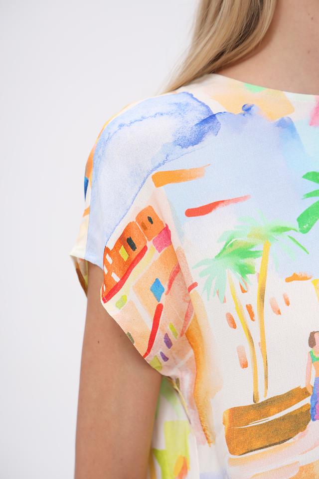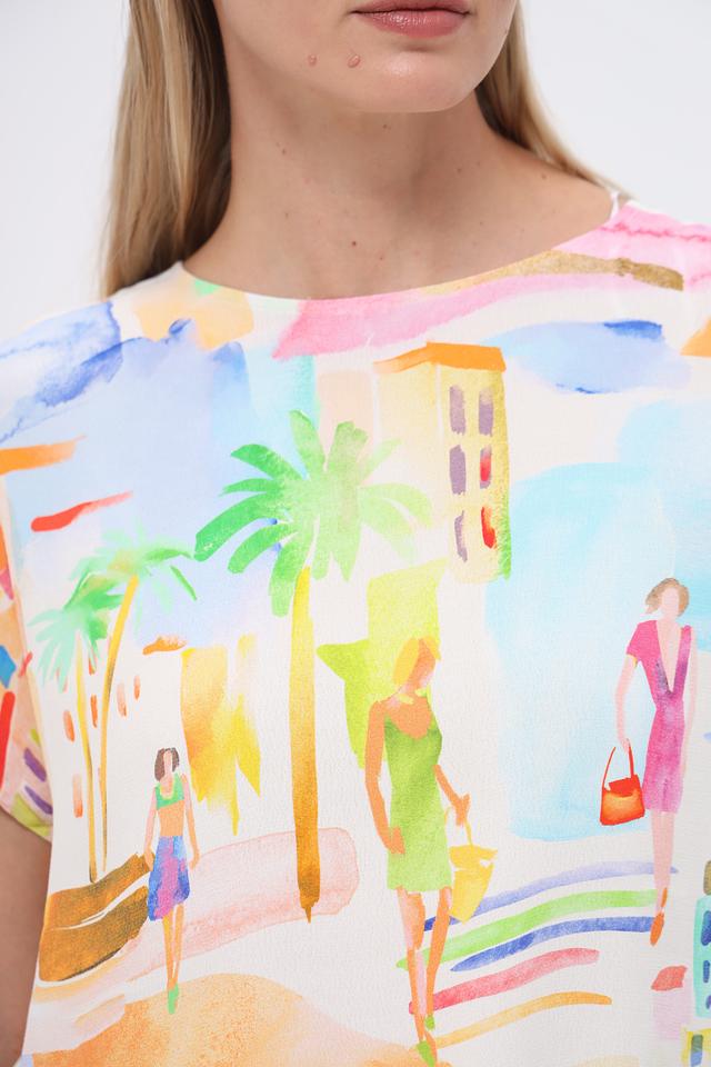 Основной акцент блузы – это оригинальный принт, выполненный в технике акварели. На нём изображены яркие городские пейзажи, пальмы и фигуры людей, создающие атмосферу летнего отдыха.