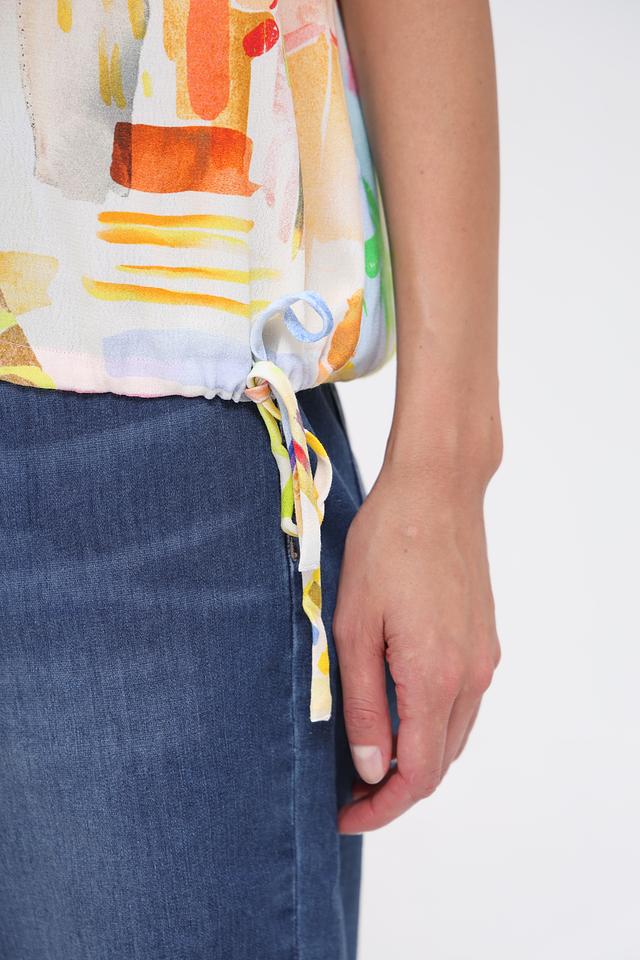 Блуза имеет короткие рукава и круглый вырез горловины. Сбоку предусмотрена небольшая сборка на кулиске с кисточкой, которая позволяет регулировать силуэт и добавляет образу игривости. Эта блуза идеально подойдёт для создания повседневных и праздничных образов.