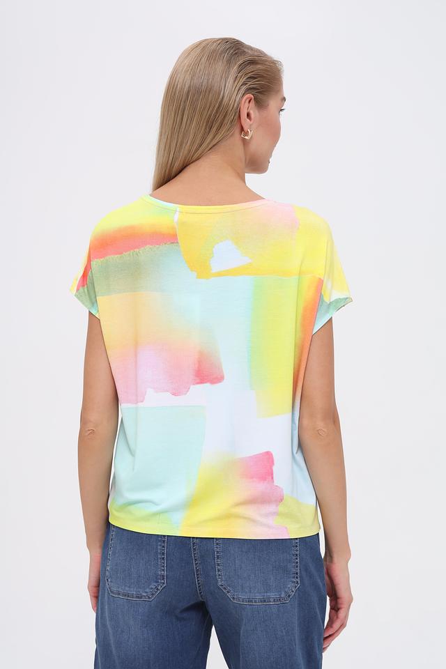 Блуза отличается оригинальным дизайном с красочным принтом, изображающим женский портрет в абстрактном стиле. Преобладающие цвета – розовый, жёлтый, голубой и зелёный, создающие эффектный визуальный образ.