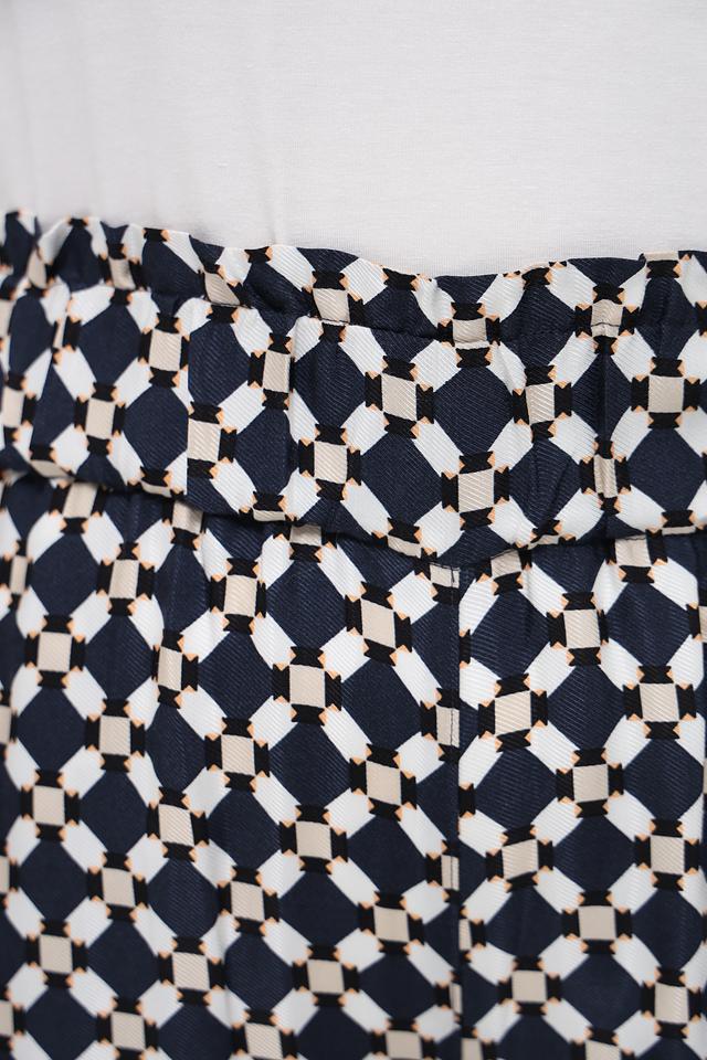Женские брюки Gerry Weber EDITION синего цвета с оригинальным геометрическим принтом и завышенной талией. Модель выполнена из мягкой вискозы с добавлением эластана, обеспечивающего комфорт при носке. Состав: вискоза 97%, эластан 3%