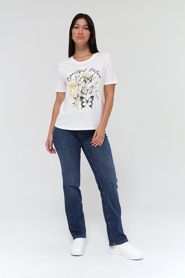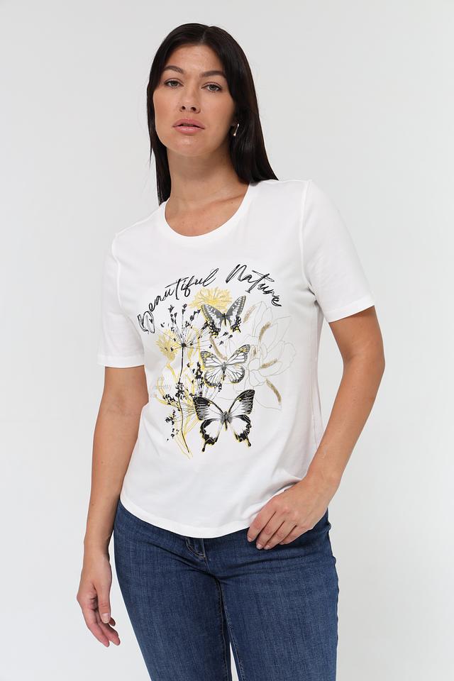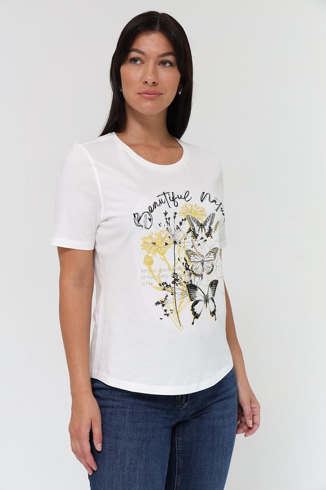 Белая футболка Gerry Weber с ярким цветочным принтом и надписью "Beautiful Nature". Изготовлена из 100% хлопка, обеспечивая комфорт и воздухопроницаемость. Идеальный выбор для создания стильного повседневного образа. Состав: хлопок 100%