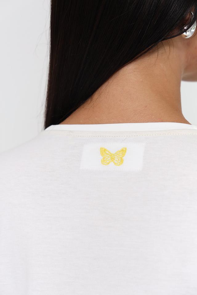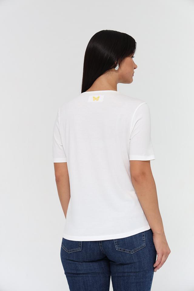 Круглый вырез горловины и короткие рукава обеспечивают свободу движений. Футболка имеет прямой крой, который подходит для большинства типов фигур. На спине расположен небольшой принт в виде бабочки, что добавляет изысканности.