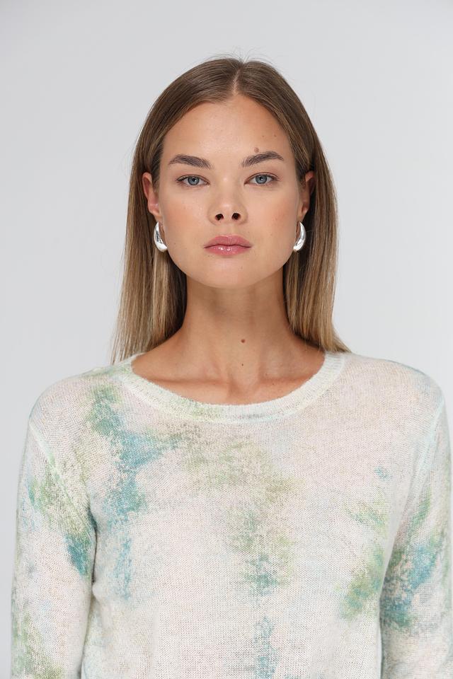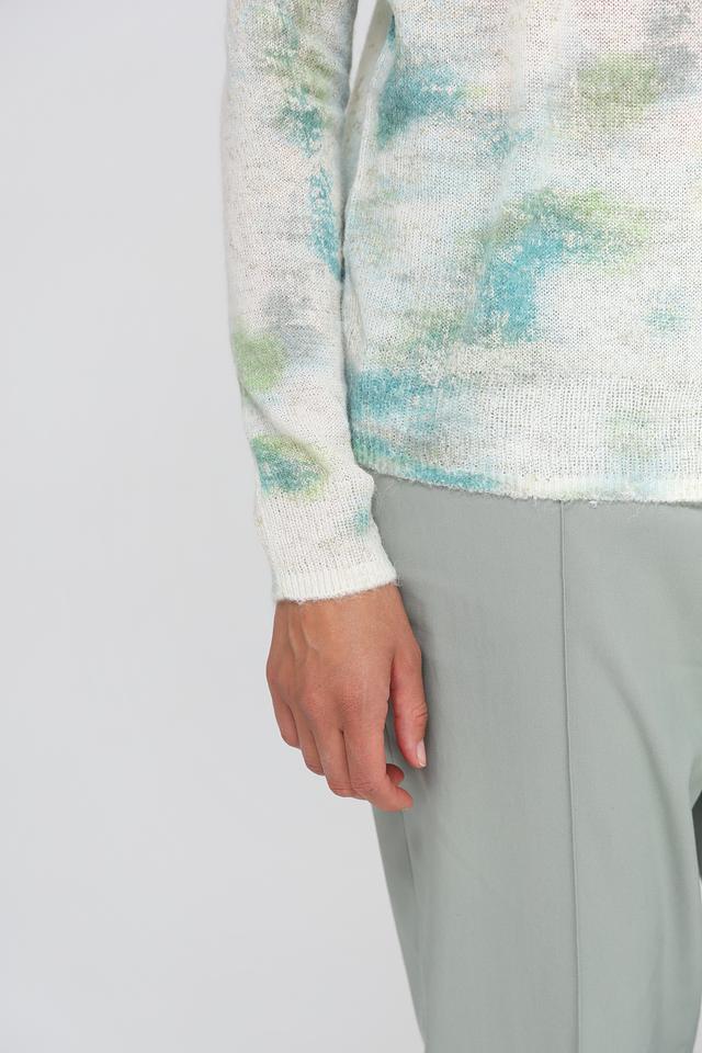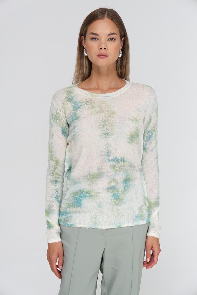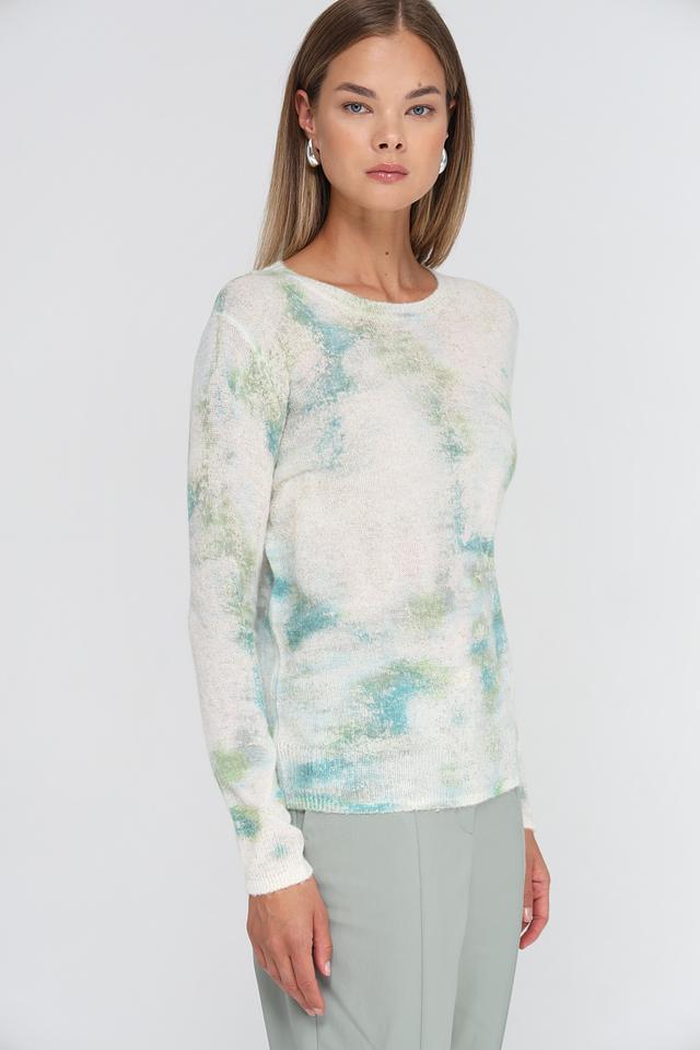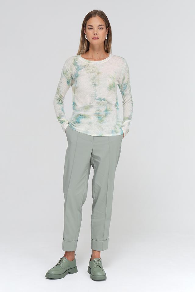 Женский пуловер Gerry Weber светло-зелёного цвета с оригинальным принтом в виде разводов. Изготовлен из мягкой смеси полиакрила, полиамида, шерсти и альпаки. Состав: полиакрил 45%, полиамид 30%, шерсть 15%, альпака 10%