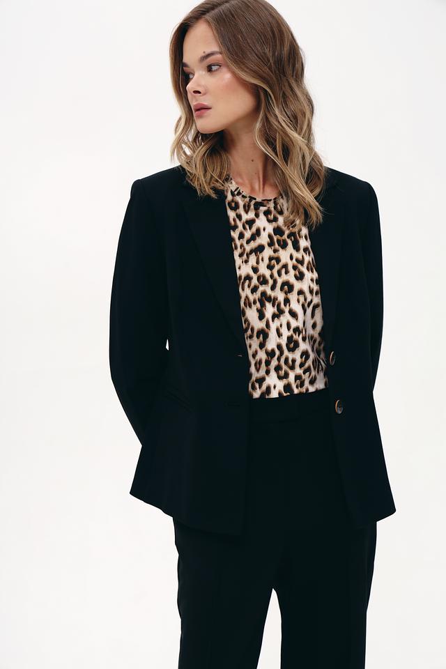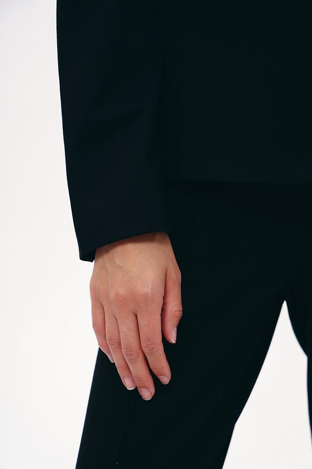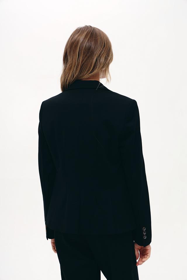 Приталенный силуэт и двубортная застёжка на две пуговицы визуально стройнят и придают образу элегантность. Отделка лацканов и боковых швов лаконична и сдержанна. На подкладке расположены внутренние карманы.