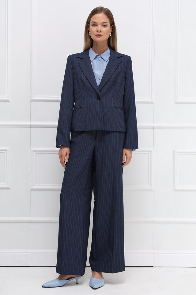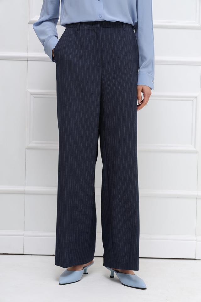 Брюки имеют прямой крой и стандартную посадку по талии. Ткань, состоящая из 77% полиэстера и 23% вискозы, приятна к телу, хорошо держит форму и практически не мнется. Тёмно-синий цвет с тонкой полоской делает эти брюки универсальными и легко сочетаемыми с различными элементами одежды.