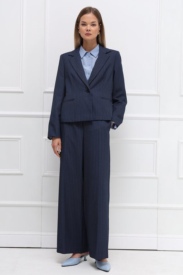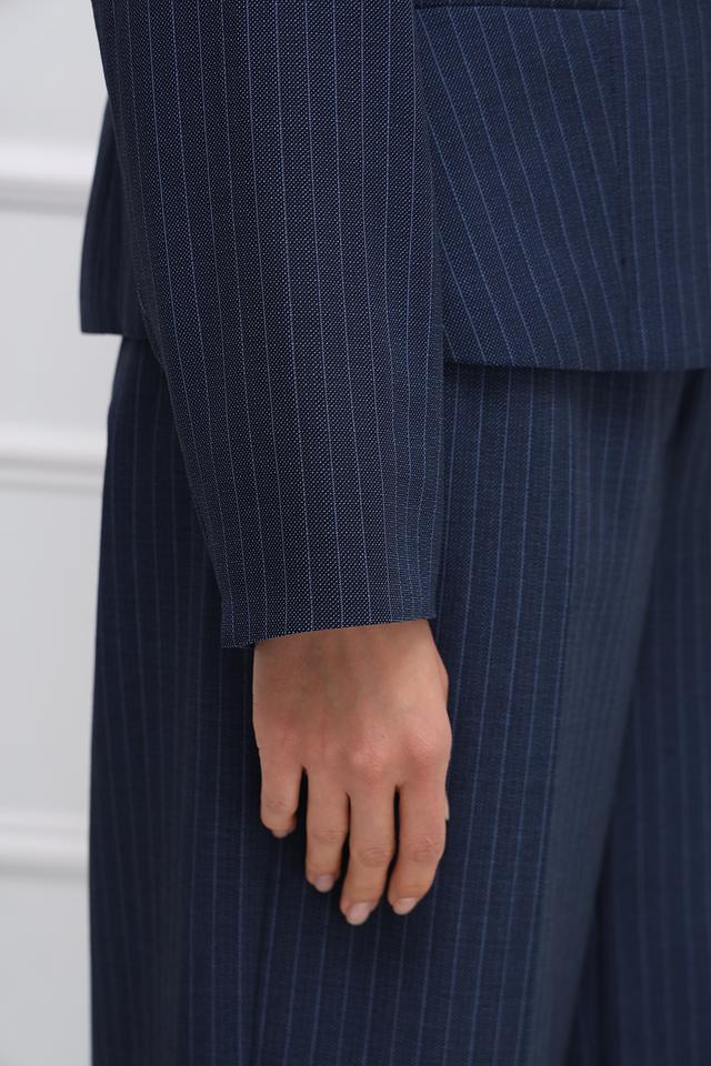 Классический крой жакета обеспечивает комфортную посадку по фигуре. Застежка на одну пуговицу подчеркивает силуэт. Длинные рукава и лацканы стандартной формы завершают образ.