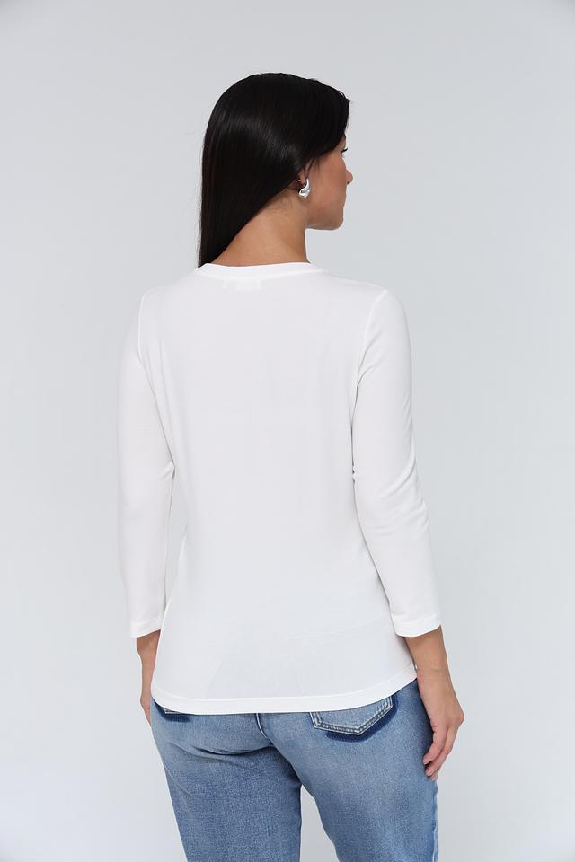 Футболка имеет прямой крой, круглый вырез горловины и длинные рукава. Материал – сочетание хлопка, модала и эластана, что обеспечивает приятные тактильные ощущения, воздухопроницаемость и небольшую эластичность.