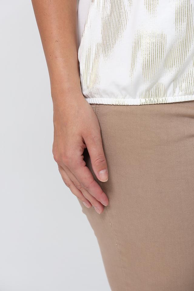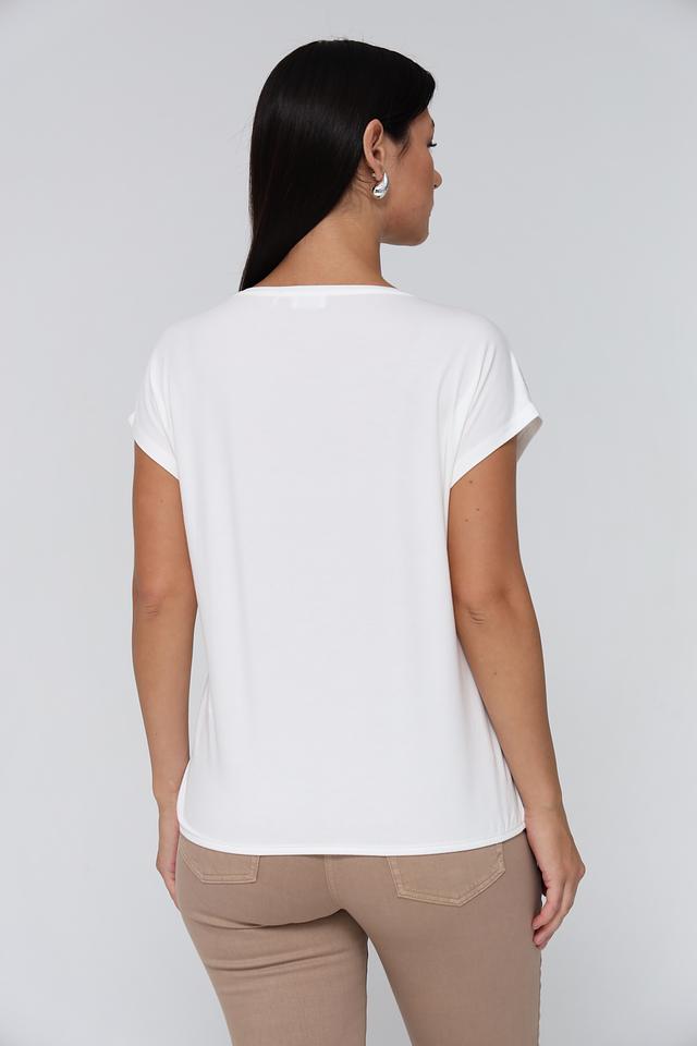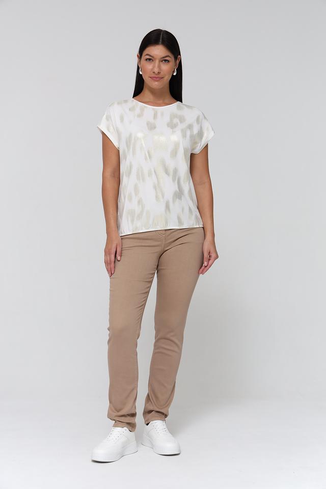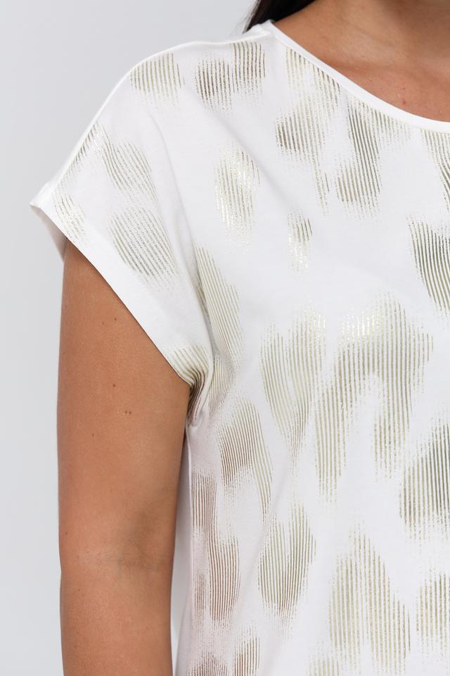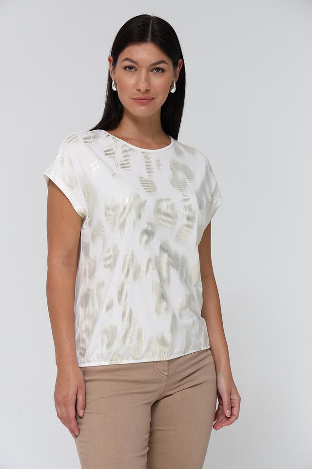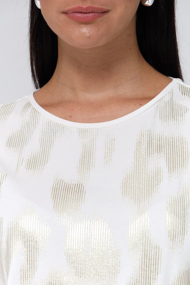 Женская футболка Gerry Weber белого цвета с оригинальным золотистым принтом. Модель выполнена из мягкого и приятного к телу сочетания хлопка, модала и эластана, обеспечивающего комфорт при носке. Состав: хлопок 47%, модал 47%, эластан 6%