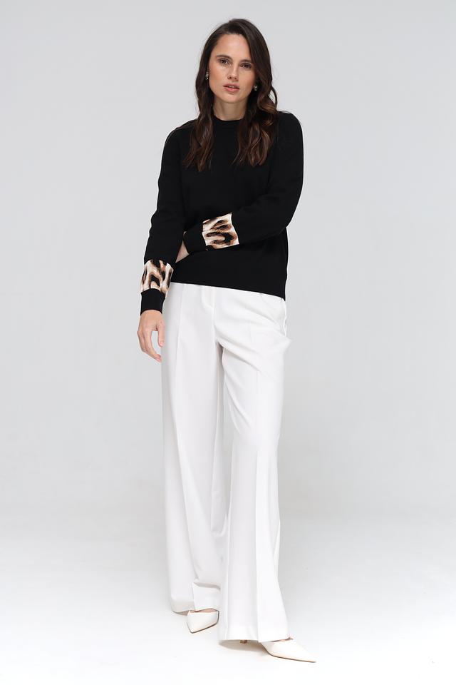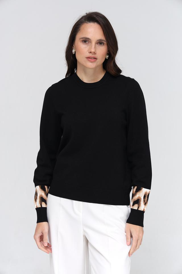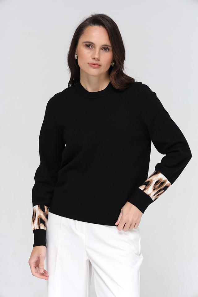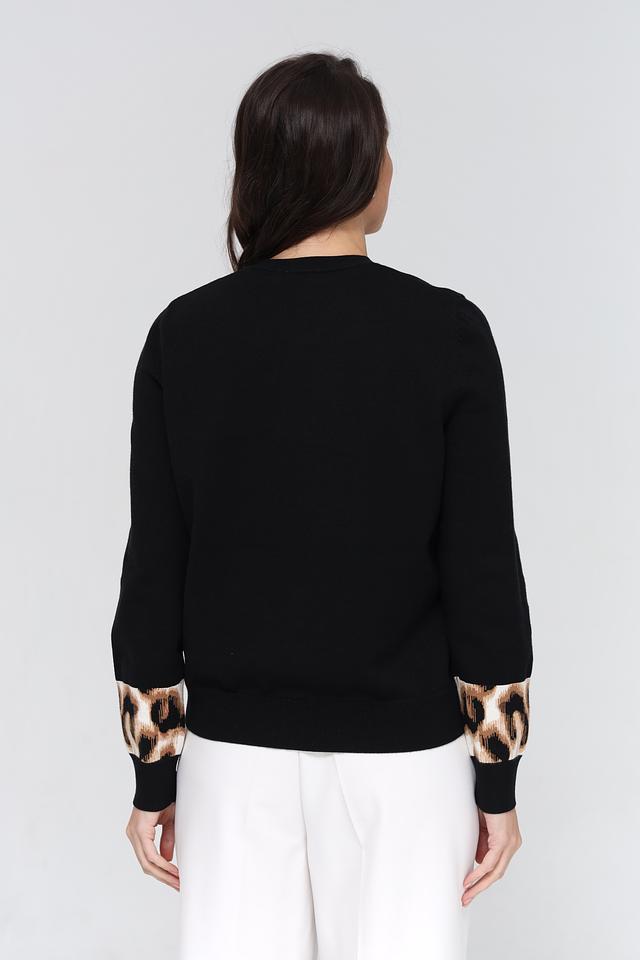 Особенностью модели являются рукава, украшенные ярким леопардовым принтом, что придает образу динамичность и индивидуальность. Пуловер имеет удобный круглый вырез горловины и стандартную длину.