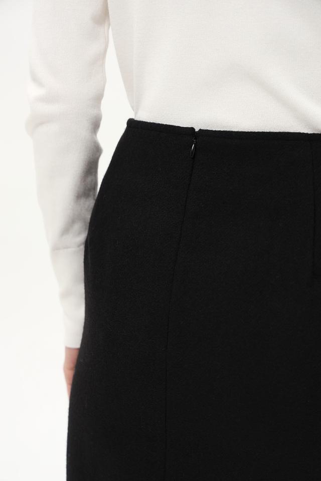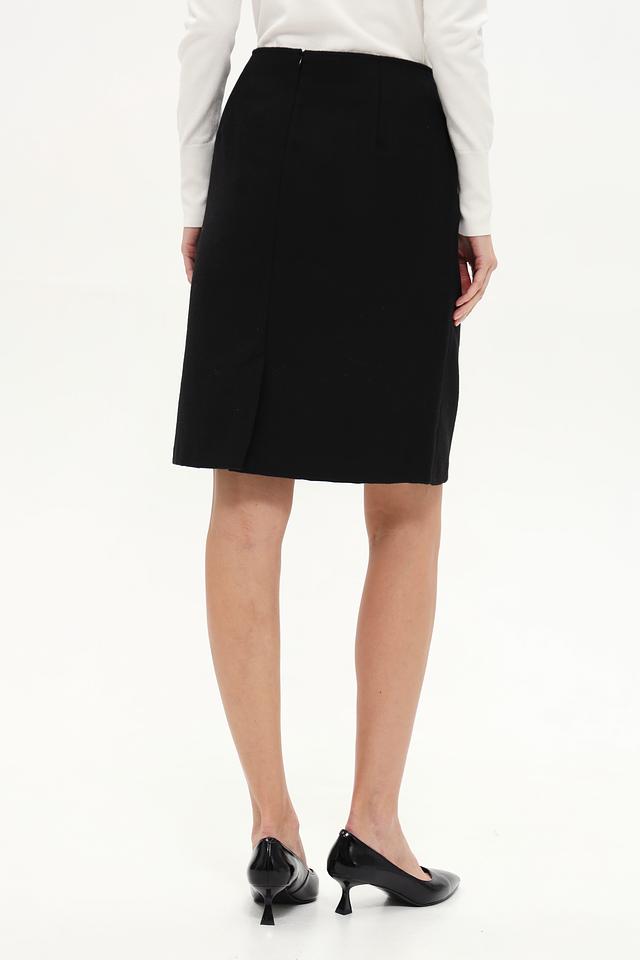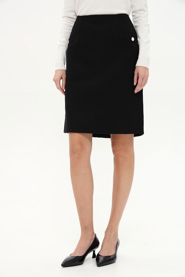 Чёрный цвет юбки позволяет легко сочетать её с различными элементами гардероба. Модель дополнена аккуратными боковыми карманами с декоративной золотистой пуговицей, что придаёт ей особый шарм. Застежка – молния сзади.