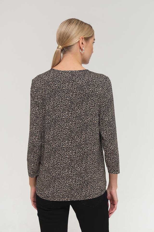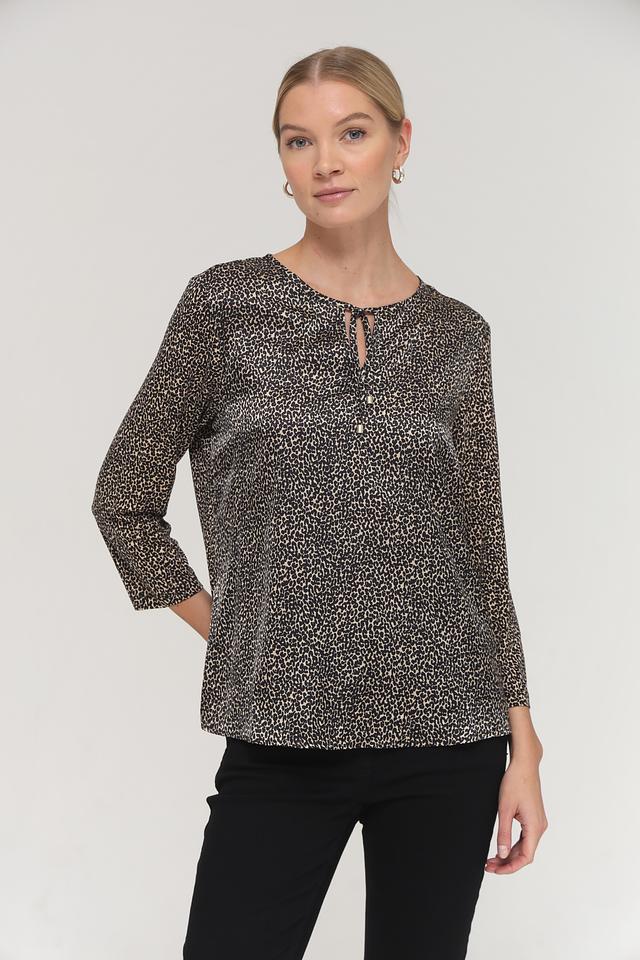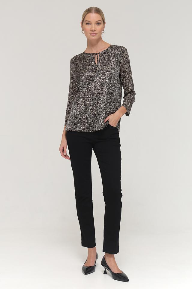 Блуза имеет свободный крой, который не сковывает движений. Вырез горловины оформлен небольшим V-образным разрезом на завязке, что придает образу женственность и изящество. Рукава блузы – три четверти, что делает ее универсальной для любого времени года.