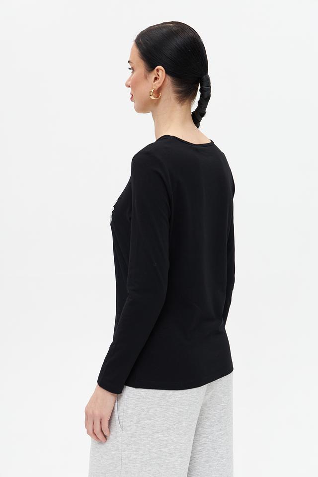 Основным акцентом является эффектный цветочный принт, выполненный в бело-серебристой гамме, придающий образу женственность и изысканность. Футболка имеет удобный крой и длинные рукава, что делает её идеальным выбором для прохладной погоды.