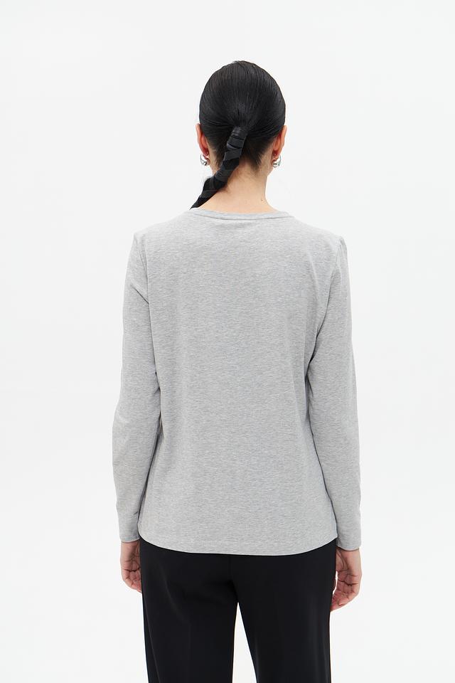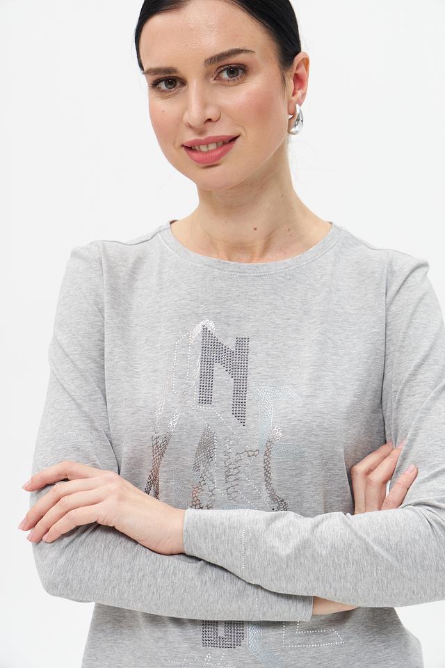 Основной цвет футболки – серый меланж. Фасад изделия украшен крупным, сверкающим декором из страз, создающим эффектный и запоминающийся образ. Декор выполнен в виде абстрактного рисунка, добавляющего изделию оригинальности.