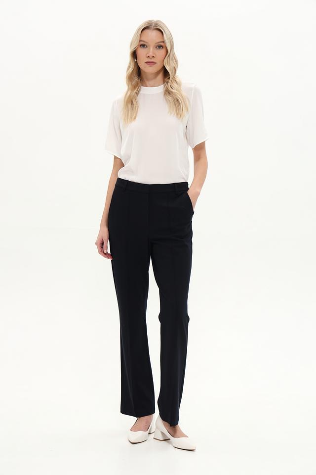 Брюки имеют прямой крой, который обеспечивает комфортную посадку по фигуре. Застёжка на молнию и пуговицу гарантирует надёжную фиксацию. Изготовлены из высококачественной вискозы (74%), полиамида (23%) и эластана (3%), что обеспечивает приятные тактильные ощущения и лёгкость в уходе.