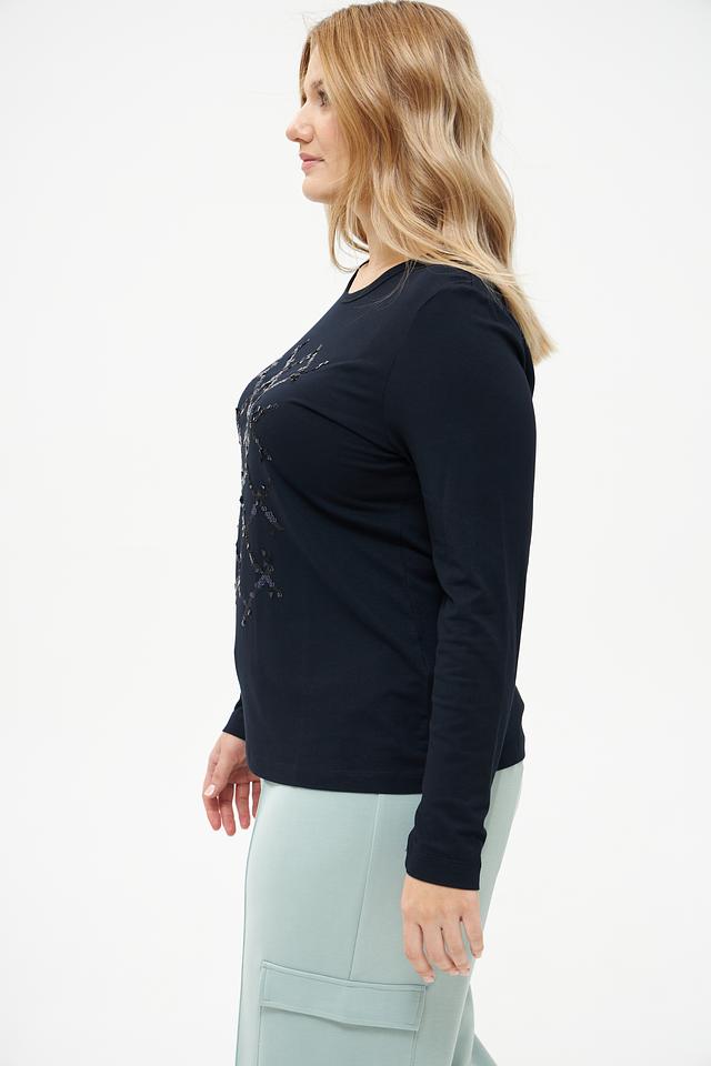 Модель имеет прямой крой и длинные рукава, что делает ее универсальной для разных сезонов. Особенностью футболки является декоративный узор из пайеток, расположенный на передней части, который придает образу изысканность и блеск.
