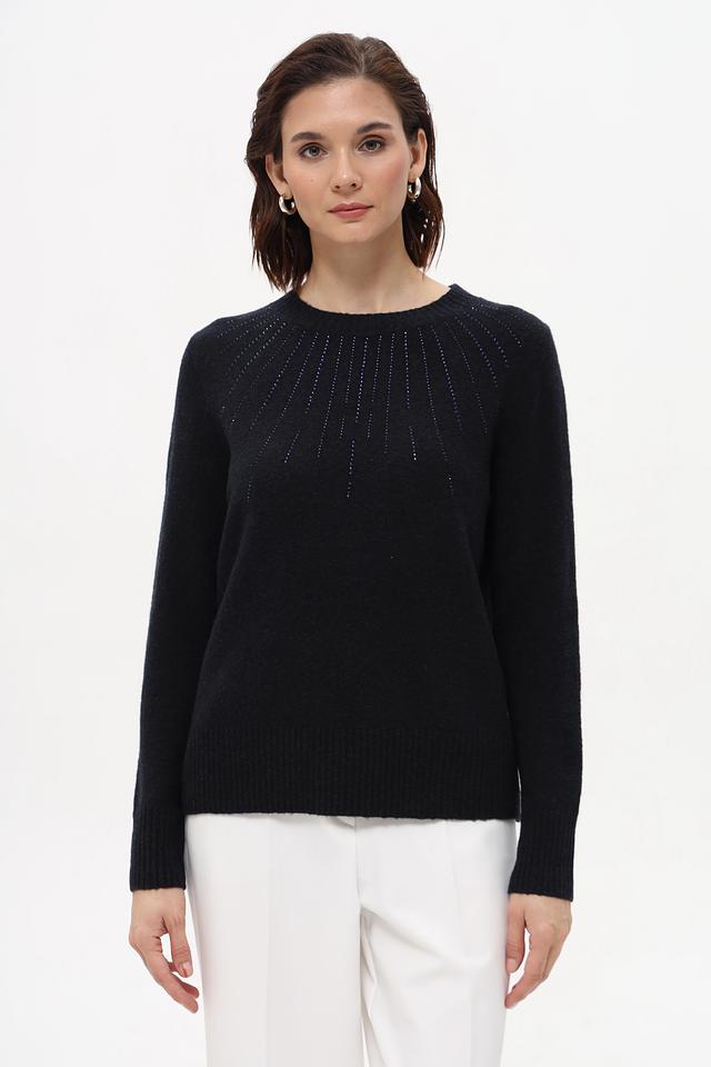 Пуловер имеет классический крой с круглым вырезом горловины и длинными рукавами. Особый акцент сделан на декоративной отделке в области плеч, выполненной в виде мелких страз, которые придают изделию изысканность и блеск.
