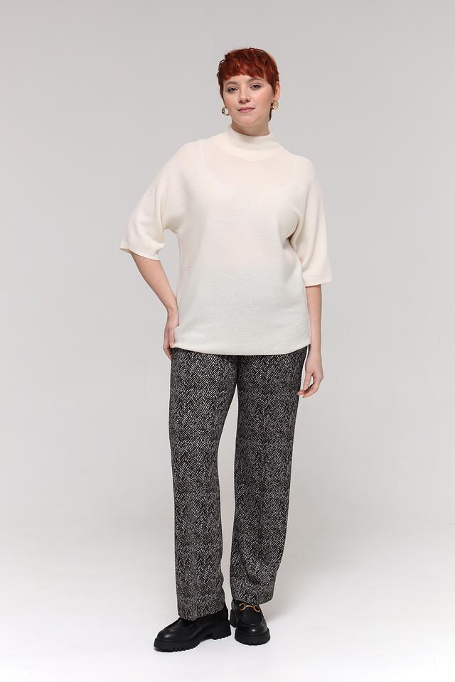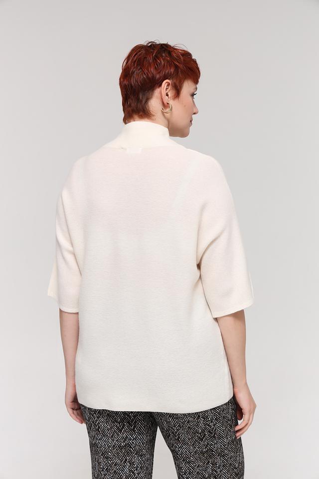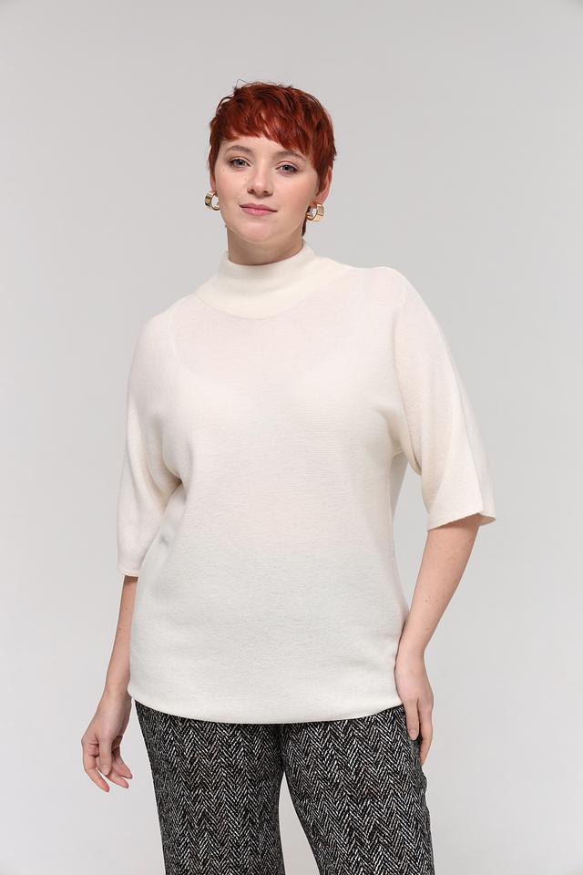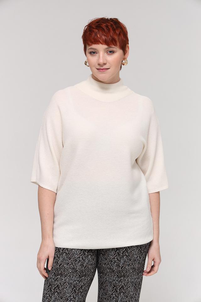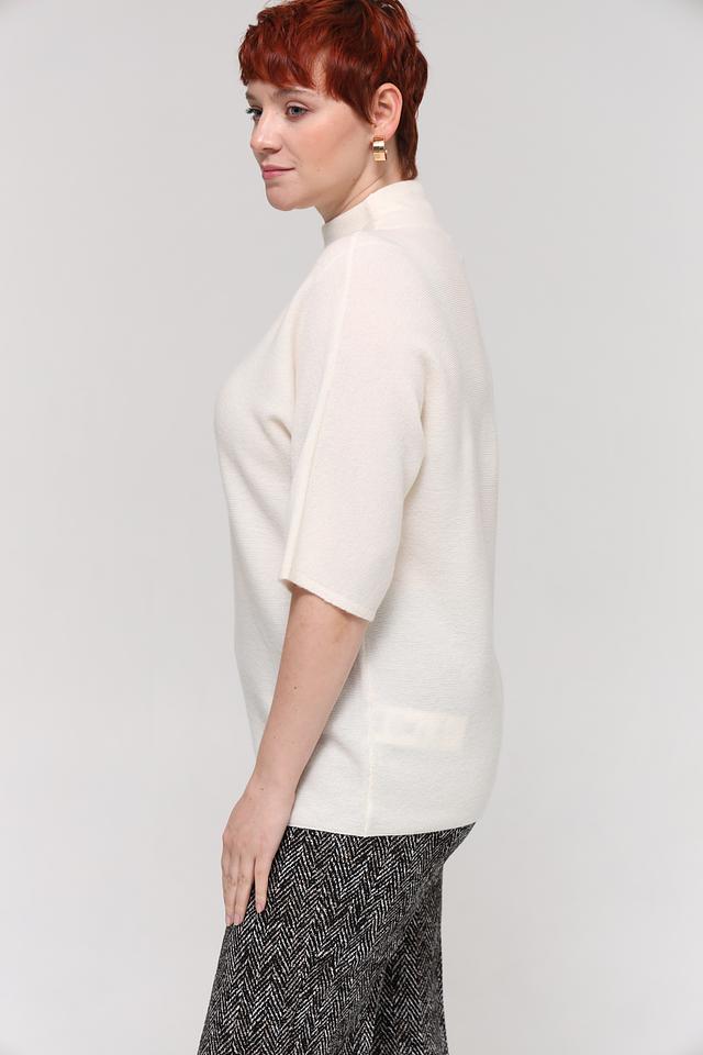 Модель имеет прямой крой, короткие рукава и воротник-стойку, что придает ей современный и утонченный вид. Пуловер идеально сочетается с брюками, юбками и джинсами, позволяя создавать разнообразные комплекты.