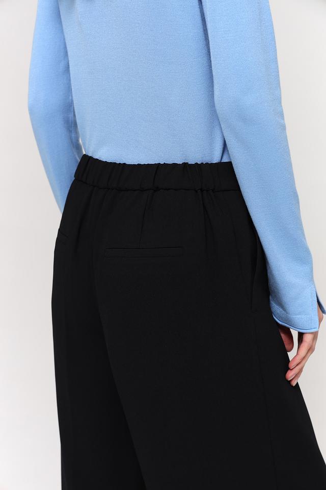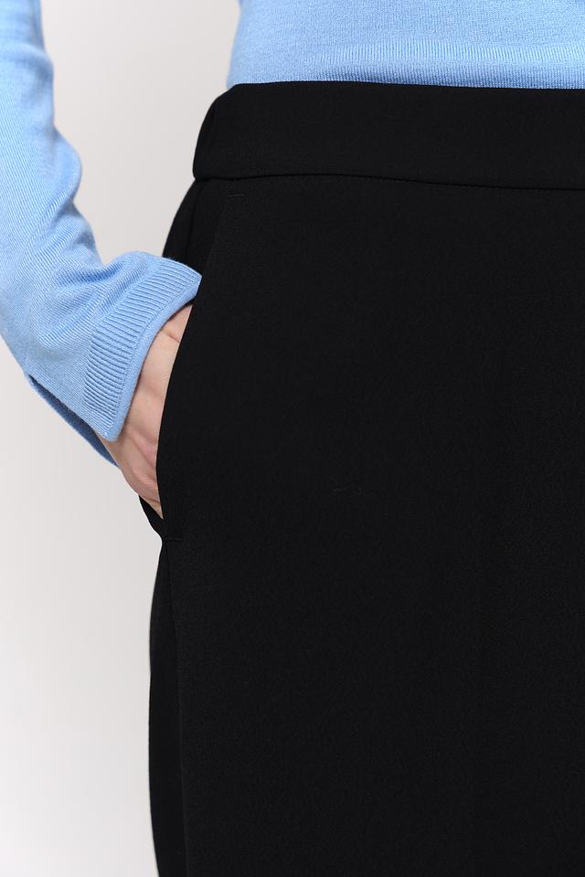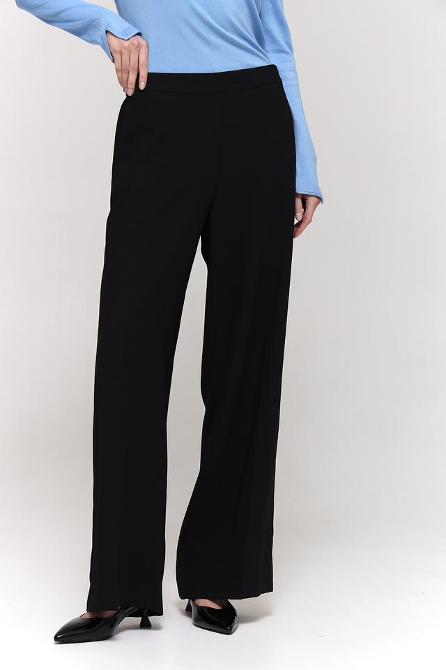 Классический чёрный цвет делает эти брюки универсальными и легко сочетаемыми с различными элементами гардероба. Прямой крой обеспечивает свободу движений и комфортную посадку по фигуре. Брюки имеют стандартную длину, подходящую для ношения с каблуками или обувью на плоской подошве.