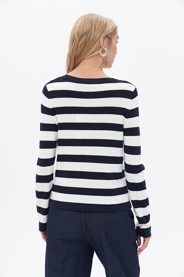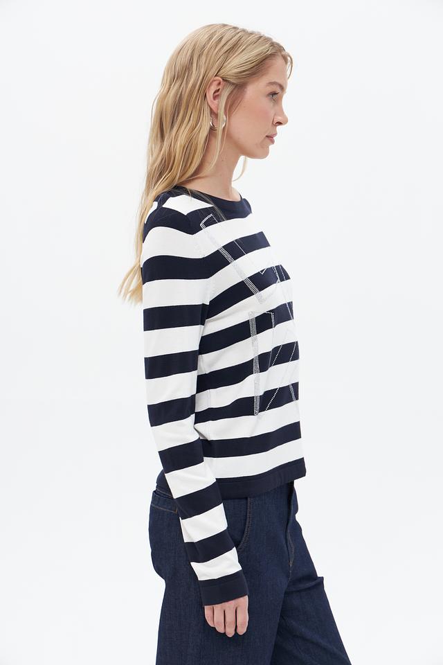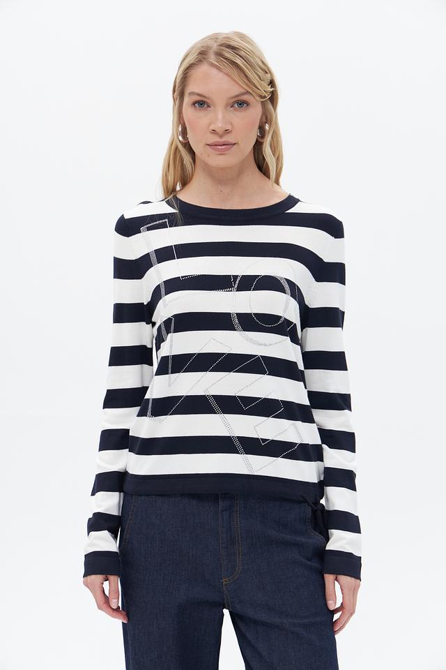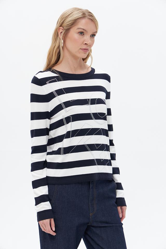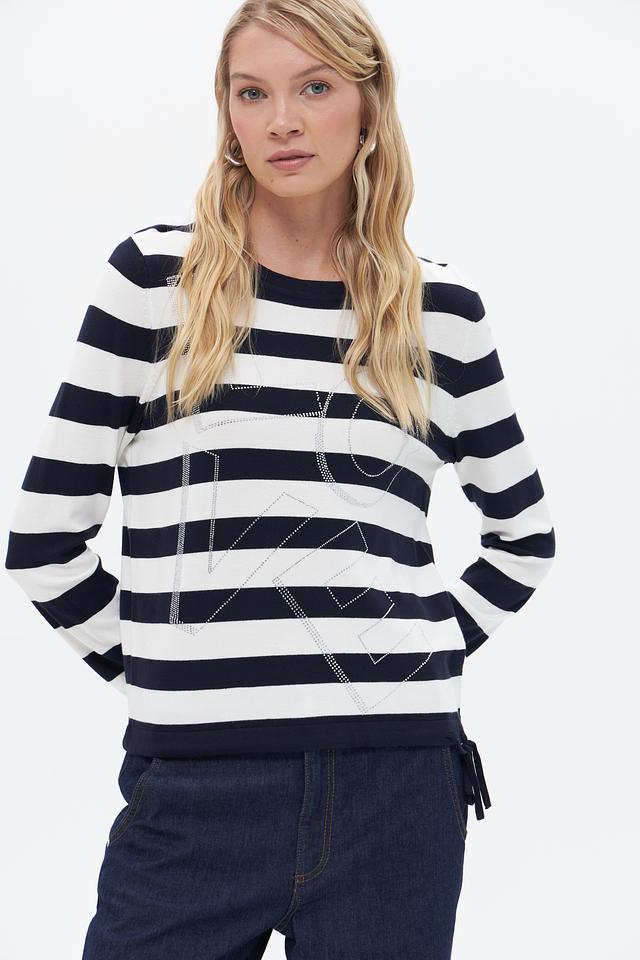 Этот стильный пуловер от Gerry Weber станет прекрасным дополнением к вашему гардеробу. Модель выполнена в классической полосатой расцветке – сочетание насыщенного синего и чистого белого цветов делает образ свежим и актуальным.